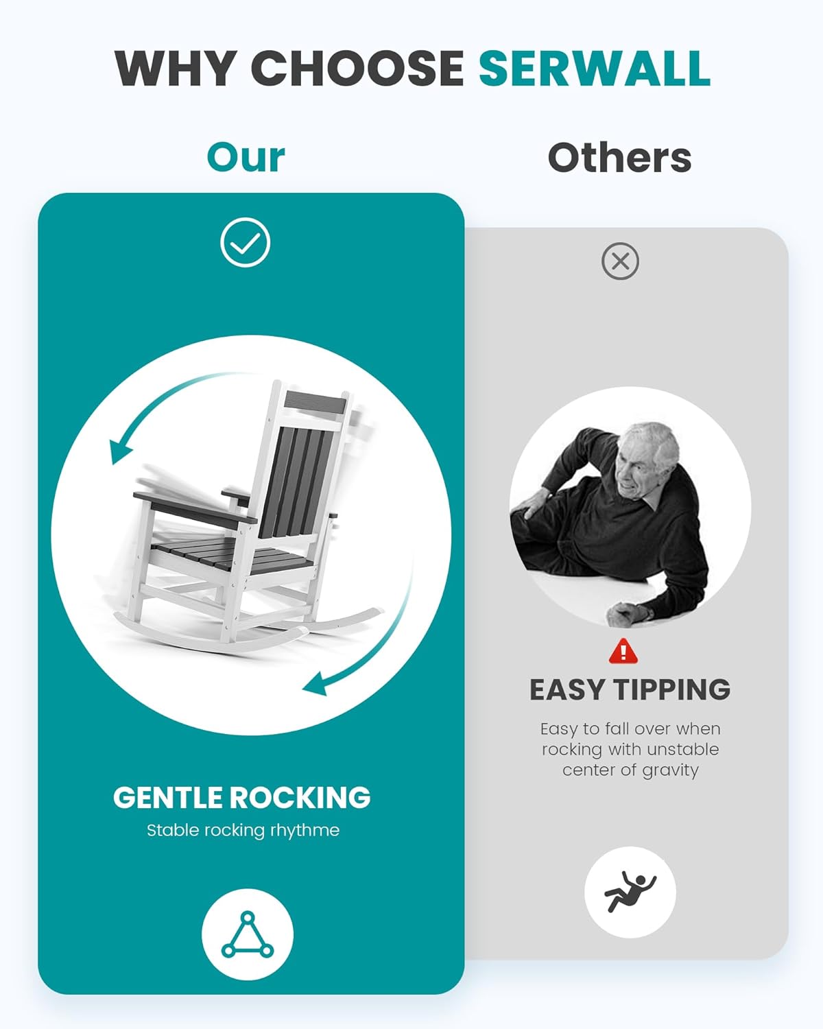- 【Anti-Rollover】Engineered for stability, our outside rocking chair boasts a 4-point design with crossbars that evenly distribute weight, coupled with a precision-calculated rocking arc for safe, relaxing use.