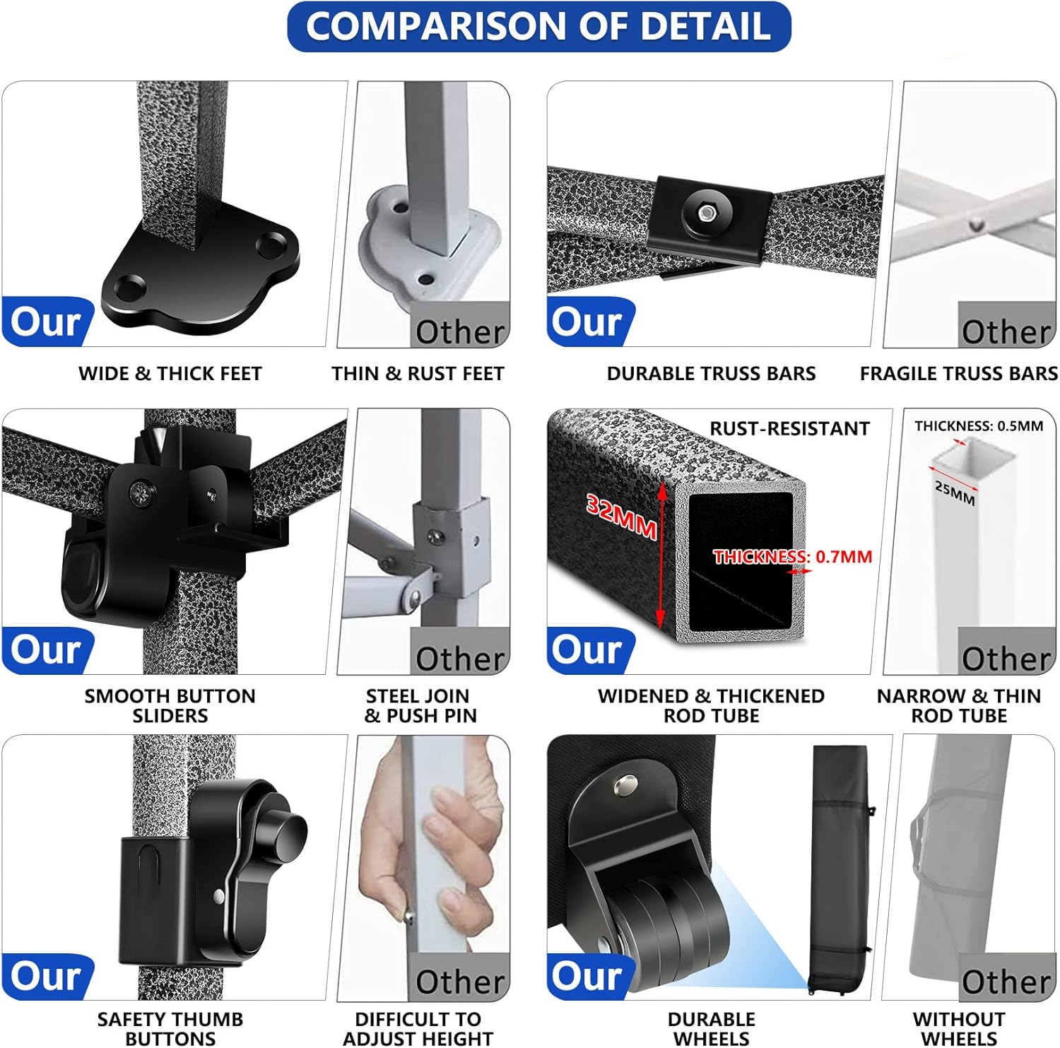 - 【Quick & Easy Setup, 3 Heights】10x20 Pop up tent can be quickly installed and dismantled by 2-3 people in minutes without tools, easily accommodates 15-20 people. Simply take the fully assembled frame out of the bag, place the fabric over it, stretch legs and done. You can adjust heavy duty canopy in 3 different heights (86", 90", 94") according to your needs with thumb button to provide enough headspace. Upgraded thumb latch system is easy to lock and release, protecting fingers from pinching.