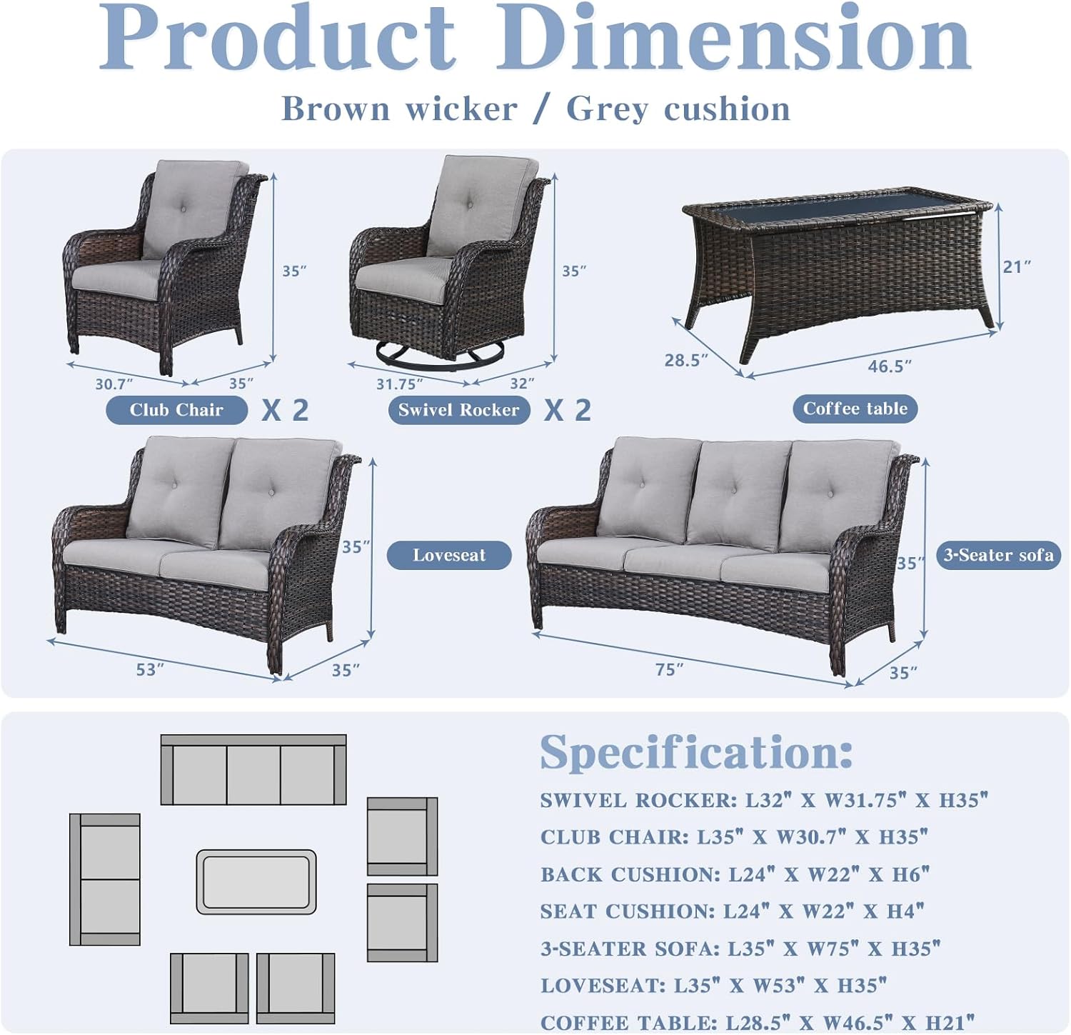 Outdoor Wicker Furniture Patio Set - 7 Piece Backyard Furniture Brown Rattan Conversation Sets with Swivel Rocker Chairs, Rattan Sofa, Club Chairs and Coffee Table, Grey Cushion