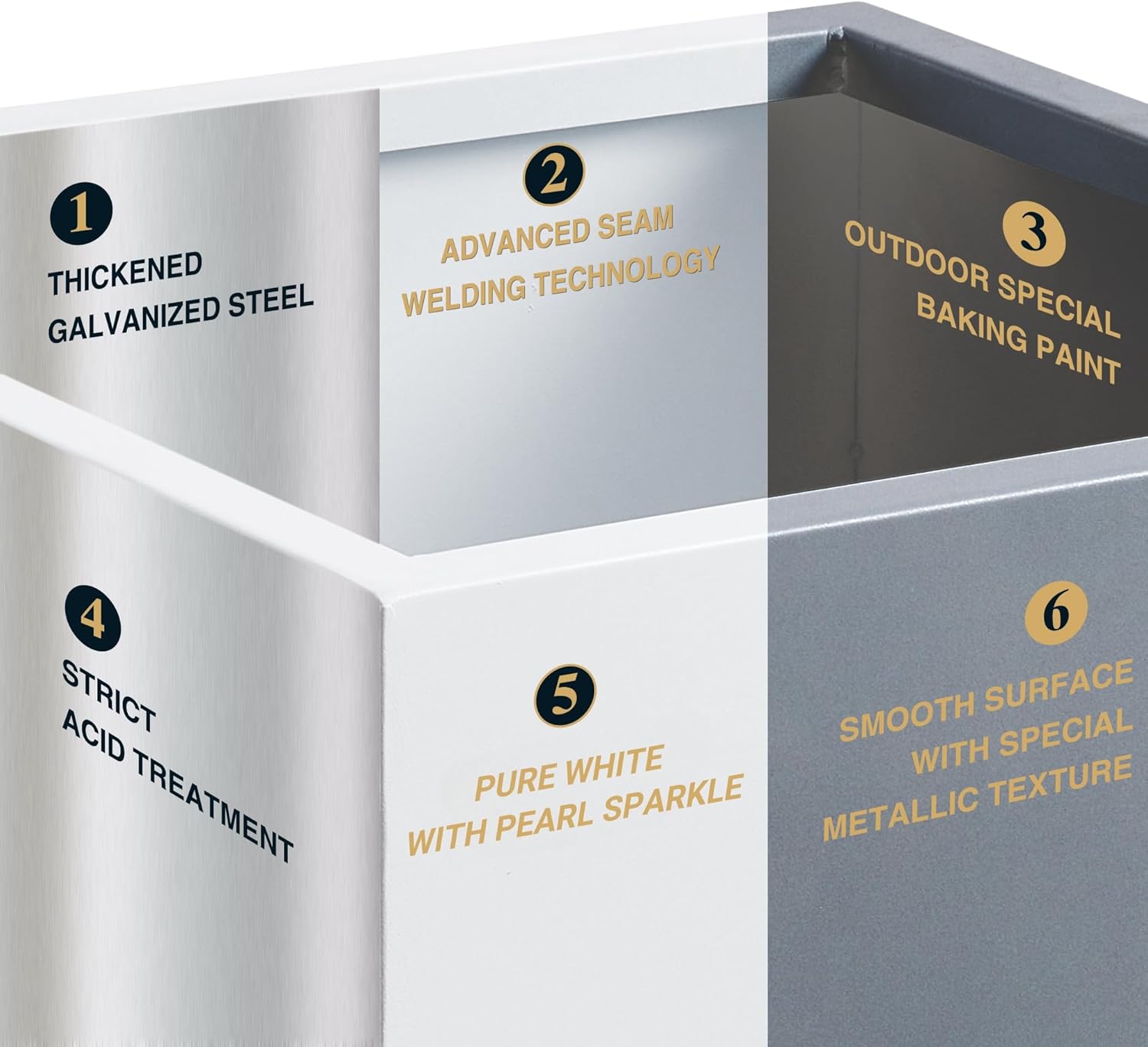 - SQUARE PLANTER BOX: This square planter is made from a fully seam welded thick galvanized steel, and adopts outdoor special baking paint, giving the surface a premium metallic color and special texture through the advanced powder injection process. This planter does not require assembly. It's suitable for planting tree.