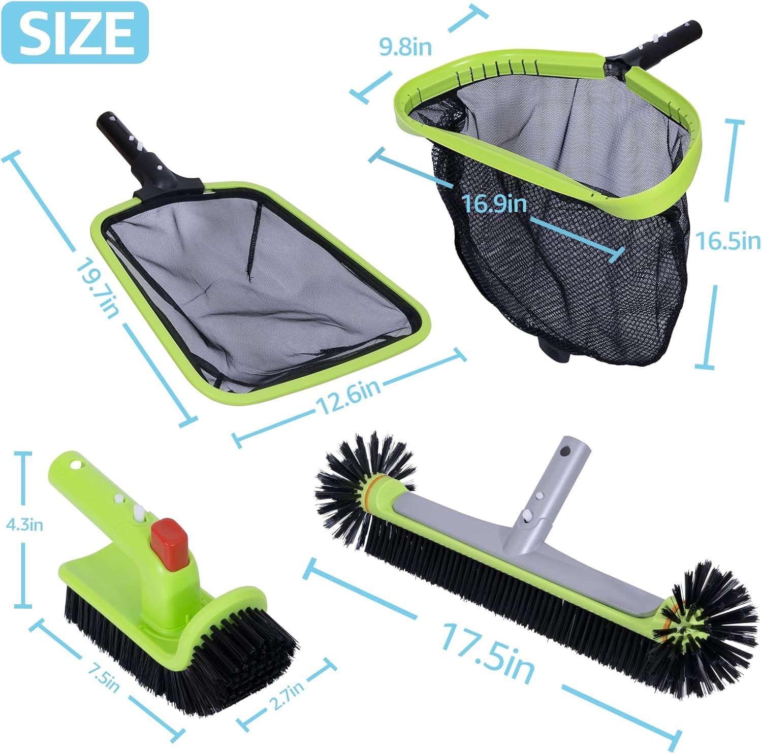 - [Keep your pool clean with ease] This kit includes a Professional pool net, semi-deep skimmer net,heavy-duty 17.5" round pool brush head, and a rotatable scrub brush.