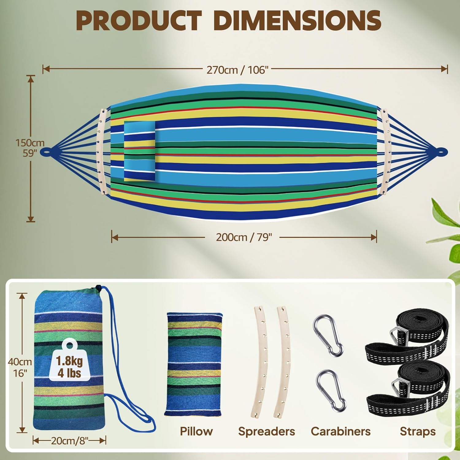 - Stability and Security:The spreader bars enhance stability, preventing excessive swaying or flipping,ensuring a secure and safe experience,especially when entering or exiting the hammock. With the included suspension system comprising two infinitely adjustable straps and two carabiners, you can easily and securely set up the hammock,promoting safe and enjoyable lounging.The suspension system's carabiners further enhance safety by offering reliable and secure attachment points.