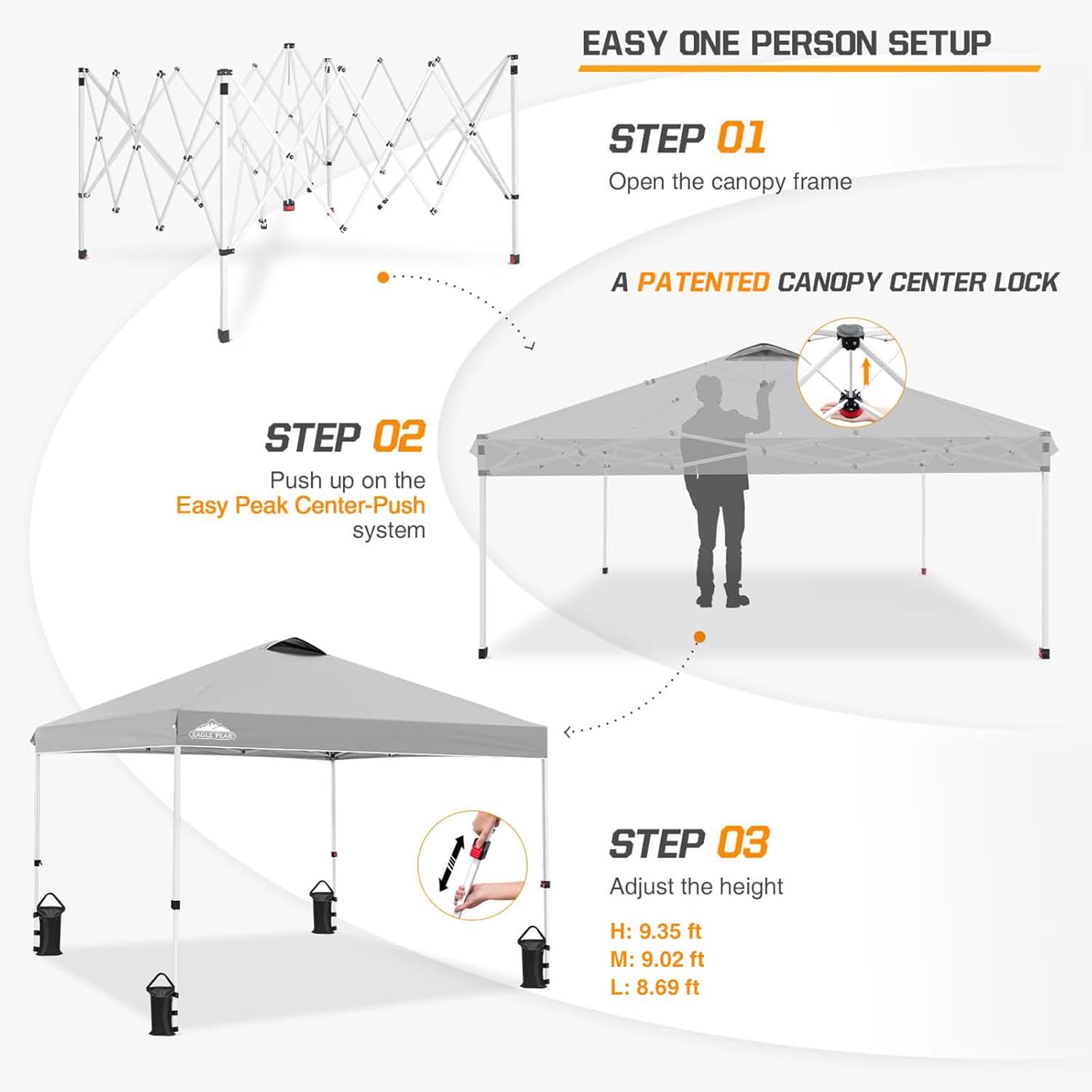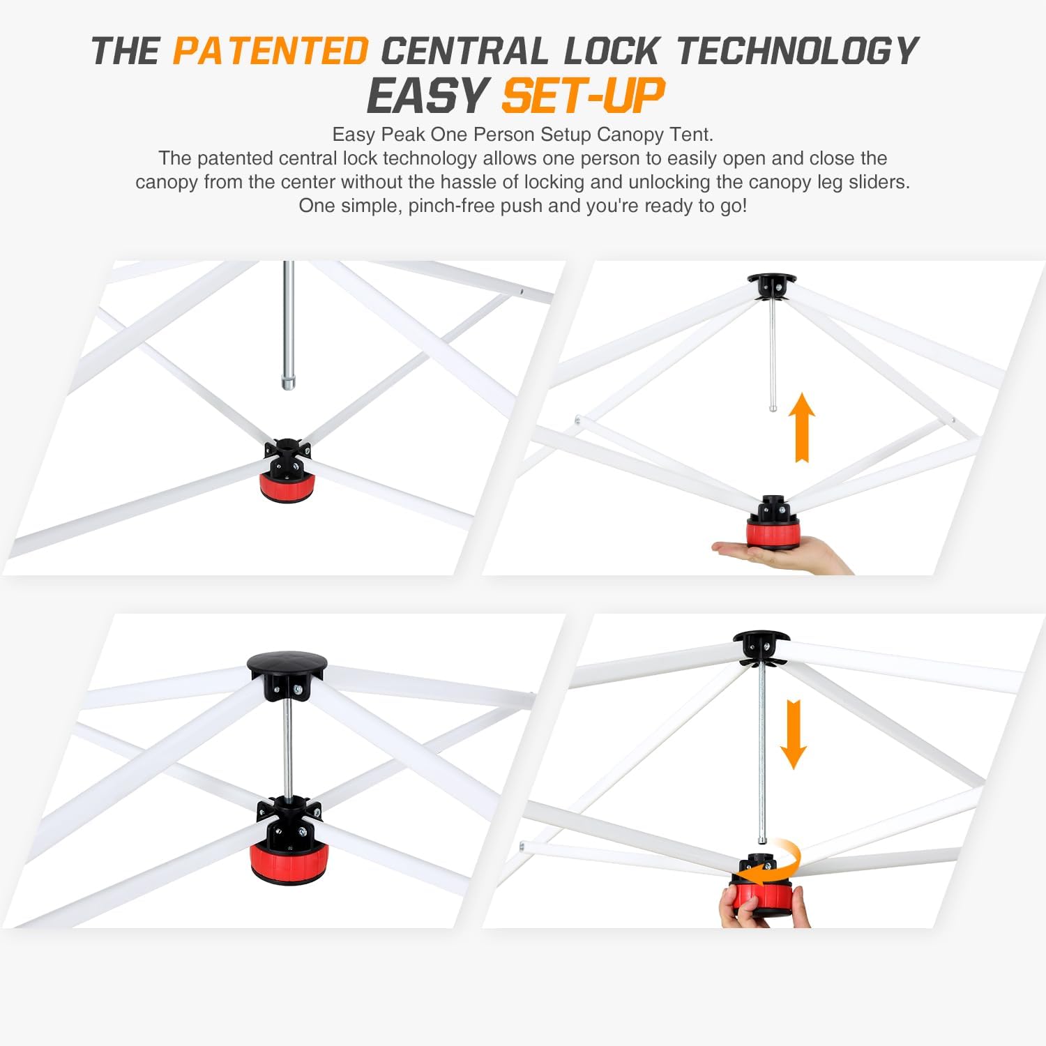 - EASY SETUP: This easy setup pop up canopy tent features the Peak Push system, a patented canopy center lock. The portable canopy requires no tools and easily opens and closes from the center in seconds. Its unique canopy tent center lock enables a quick, one person setup, letting you maximize outdoor time with minimal effort