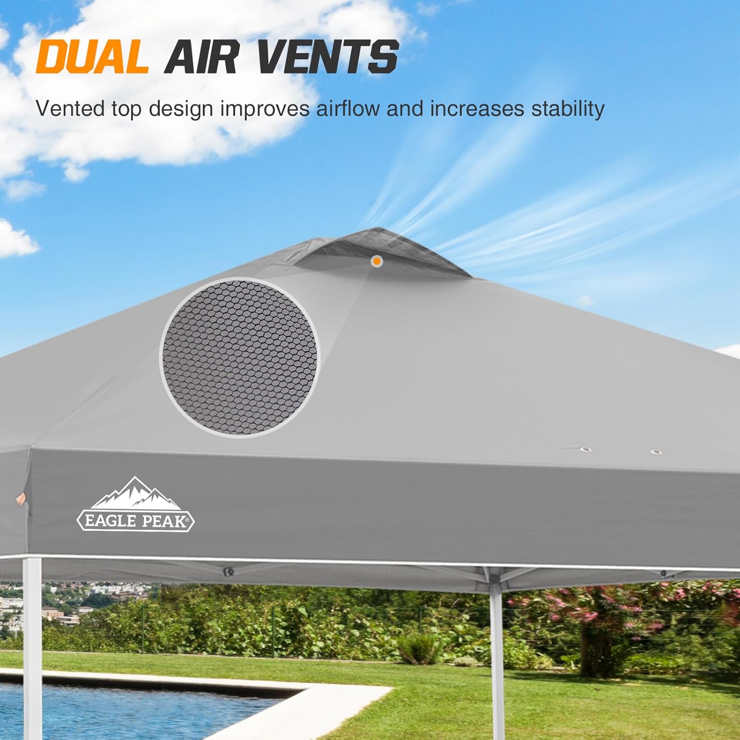 - HEAVY DUTY TOP WITH VENTED DESIGN: The EAGLE PEAK canopy features a CPAI-84 rated 150D silver-coated oxford top with double-stitched and heat-sealed seams for long lasting waterproof performance. This durable pop up canopy provides UPF 50+ sun protection and a large vent at the peak to release heat; ideal for staying cool at outdoor events, markets, or backyard gatherings