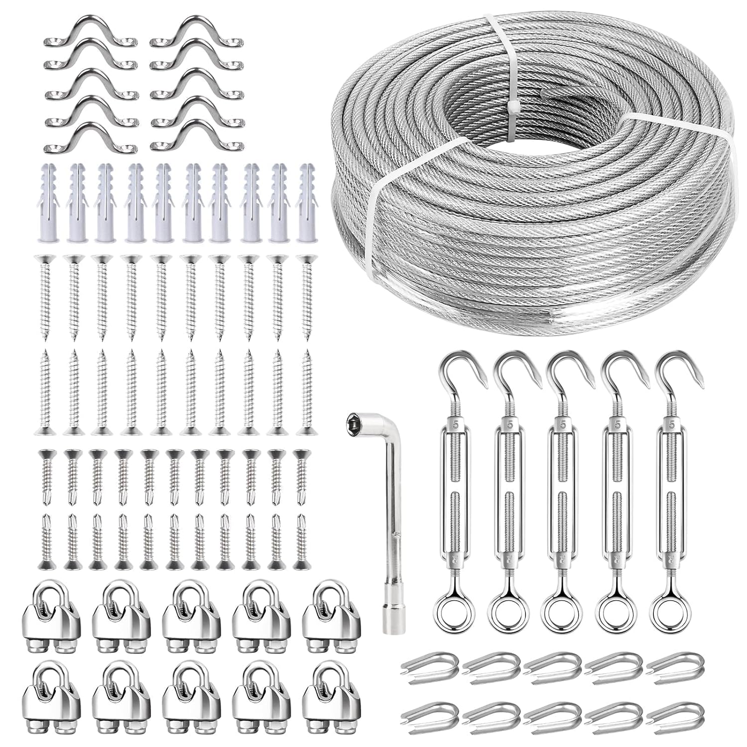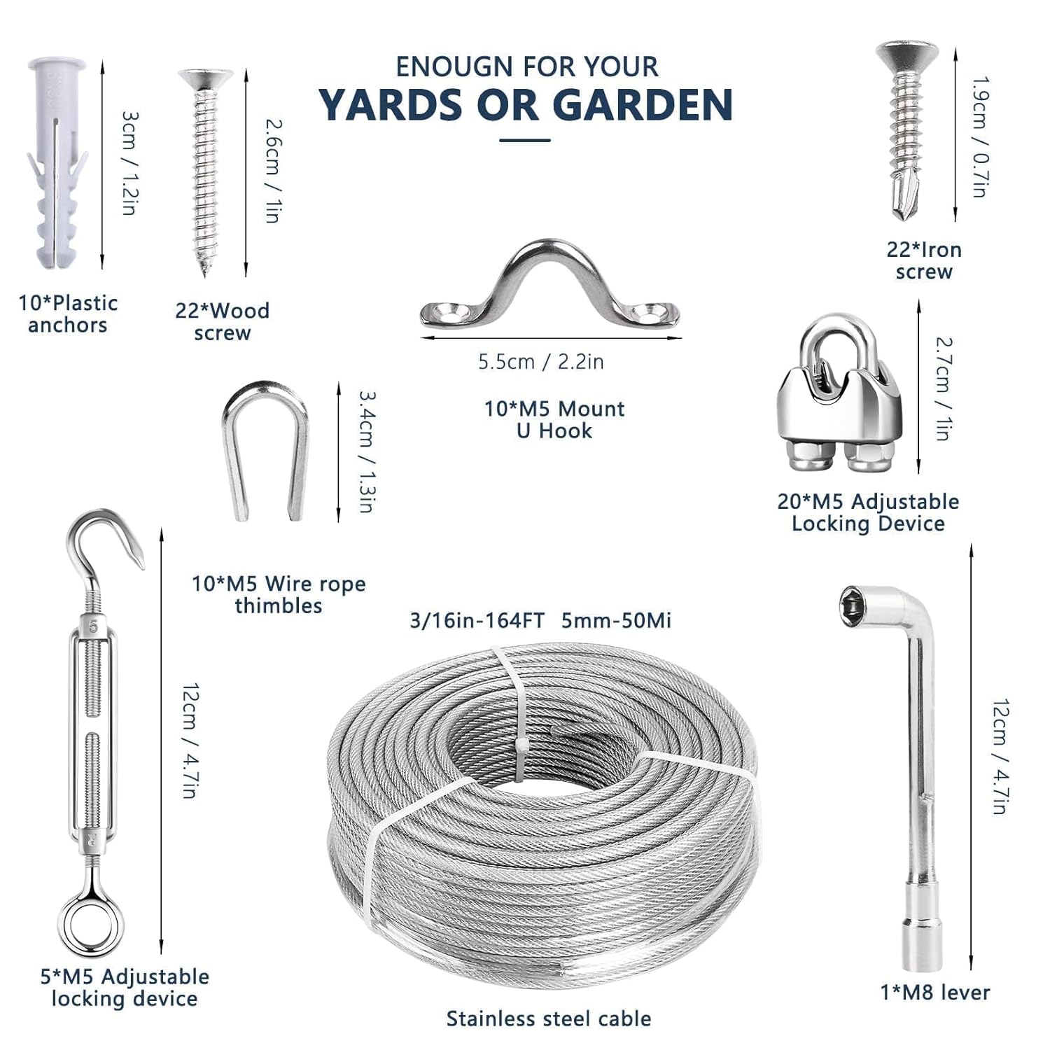 - Complete 3/16" Wire Rope Kit: 165ft 3/16 vinyl coated wire rope, 5 M5 turnbuckles for cables wire, 20 M4 wire rope clamps, 10 M5 thimbles, 10 M5 Mount U Hook, 22 Iron Screws, 22 Wood Screws, 10 Plastic Anchors, 1 M8 Wrench. Perfect for DIYers needing reliable solutions for anchored shed, fencing, sunshade