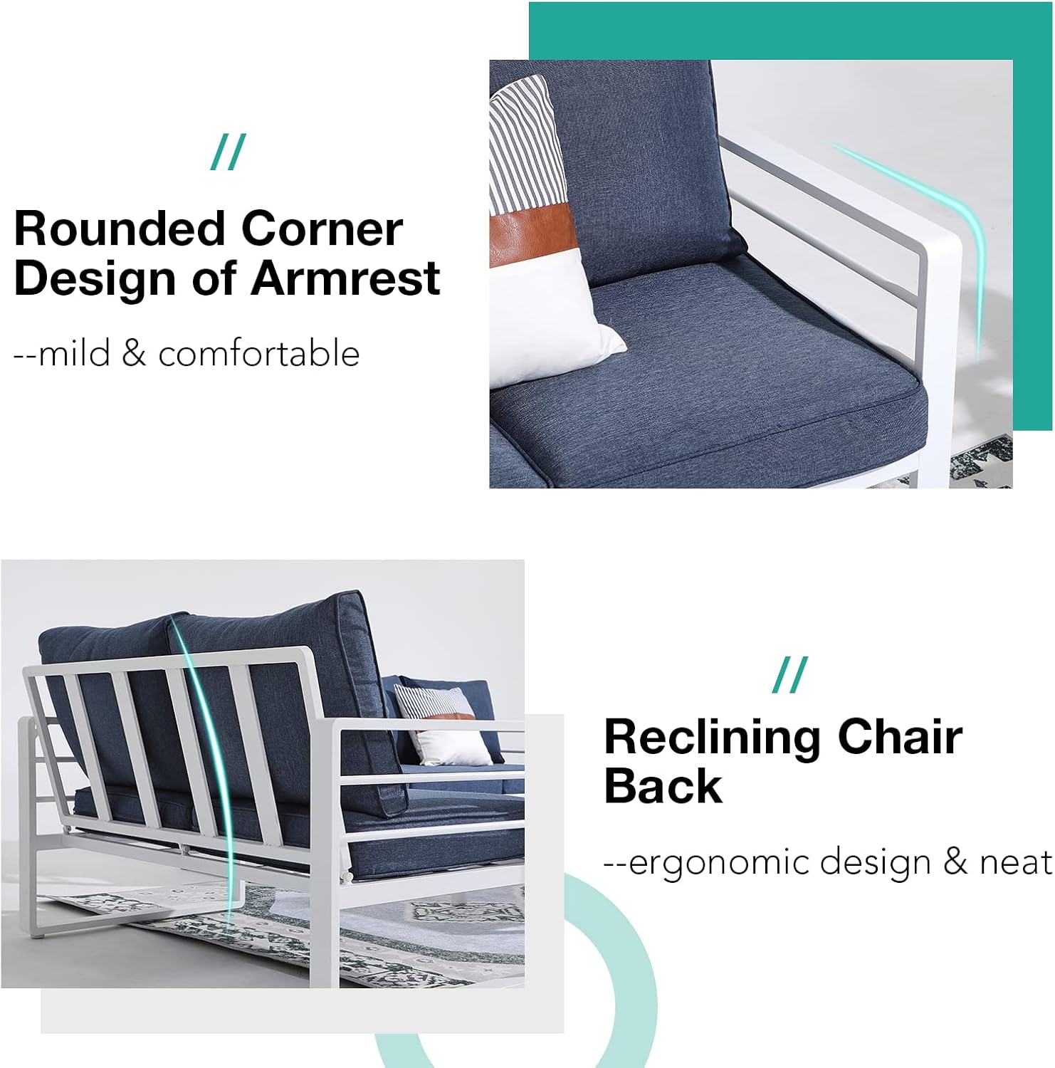 Patiorama Aluminum Patio Furniture Set, Outdoor Patio Loveseat, 2 Seat Sofa Couch, All Weather White Metal Chair with Olefin Cushion, Deep Seating, 600 lbs Capacity, Deck, Garden-Blue Cushion