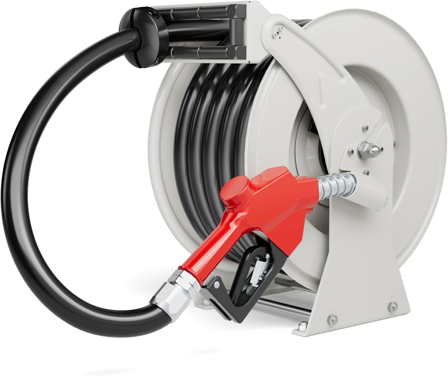 - Lock Length & Auto Rewind: The retractable fuel hose reel can be locked at desired length by its metal latching pawl when the clicking sound is heard. A short tug could unlock the hose to let it retract all the way back smoothly and nicely