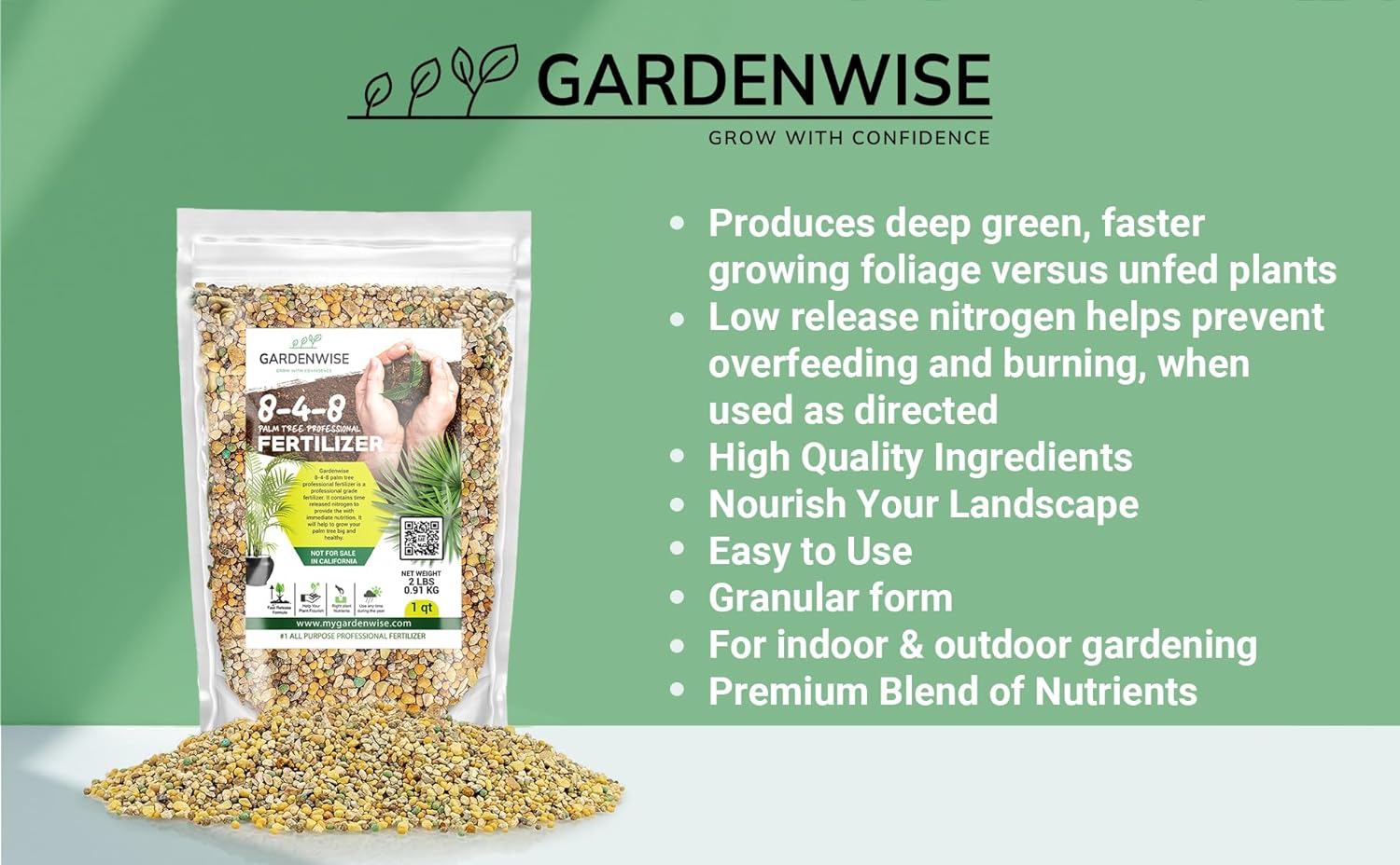 - ๐ด Optimal Nutrition for Palm Trees: With a balance of 8% nitrogen, 4% phosphorus and 8% potassium, Gardenwiseโs robust 8-4-8 fertilizer expertly nourishes your palm trees! Enjoy new, vibrant and plush plume growth, creating a tropical paradise canopy!