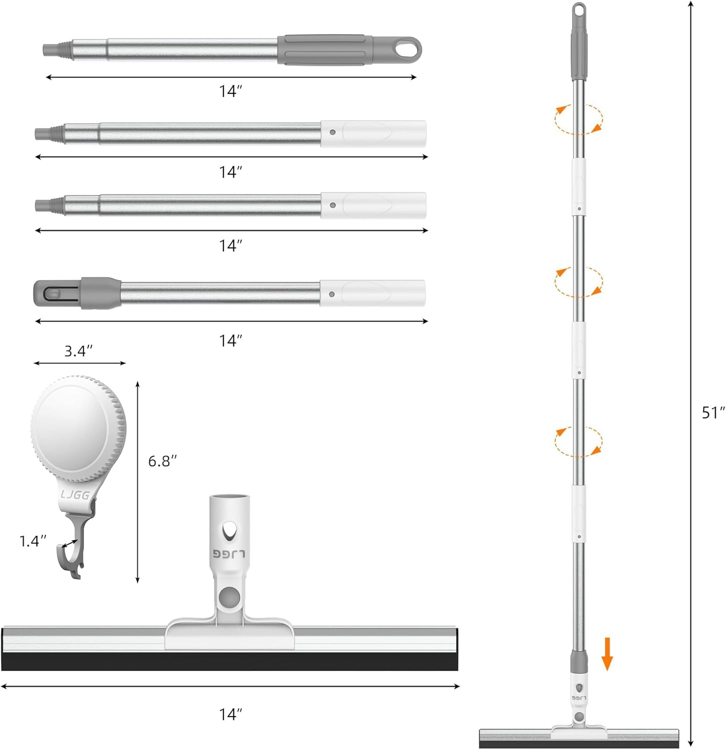 Squeegee Broom for Floor, 13.78" Rubber Squeegee with 51" Aluminum Alloy Pole for Bathroom Tile, Garage Concrete, Deck, Shower Glass, Window Cleaning, Squeegee Broom for Household Floor