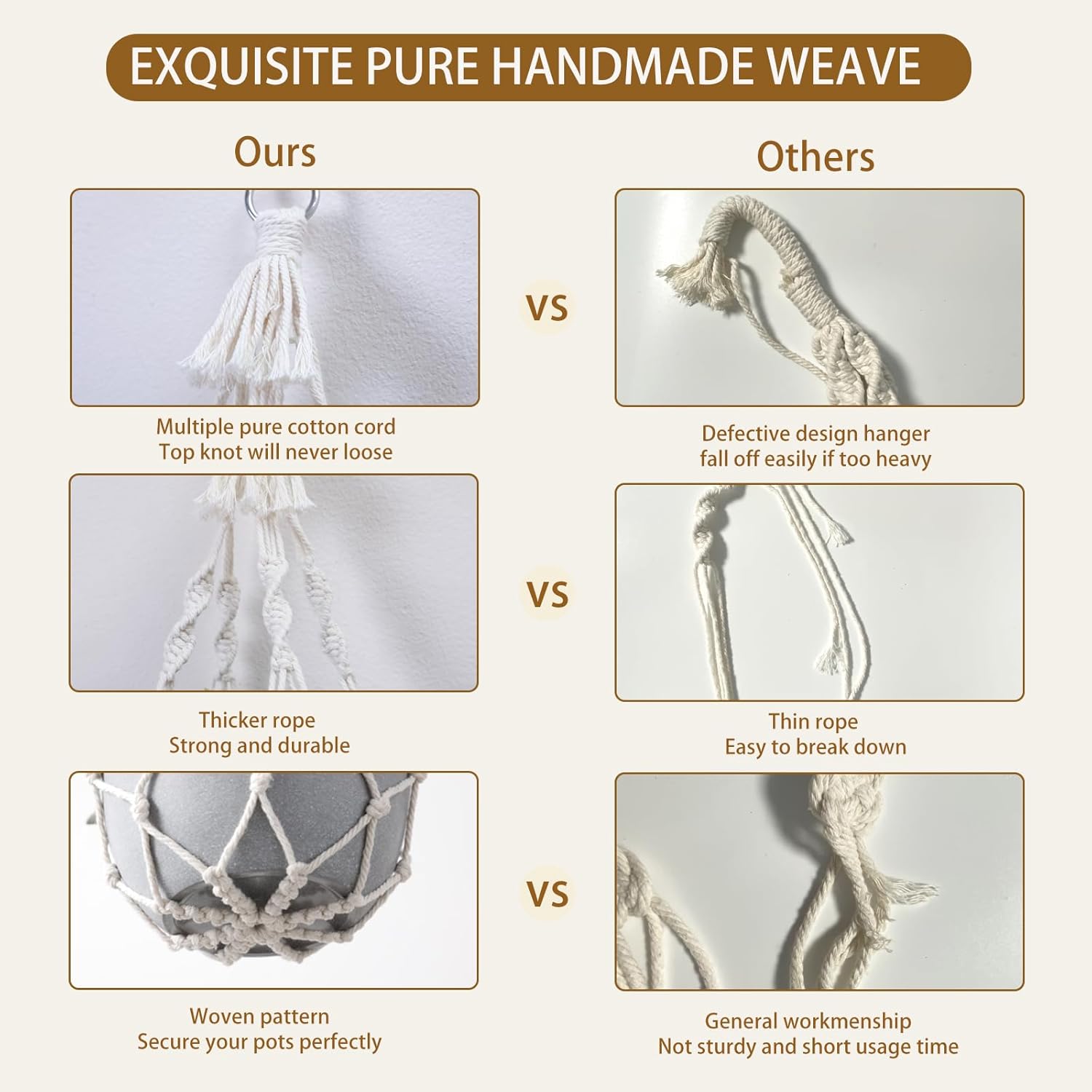 - HANDMADE WEAVING CRAFT - Hanging plant holder made from eco-friendly cotton rope and metal ring, It has a strong flexible woven design, sturdy and durable, enough to hold the weight of the pots, not easy to break, you can take them home for your plants with confidence