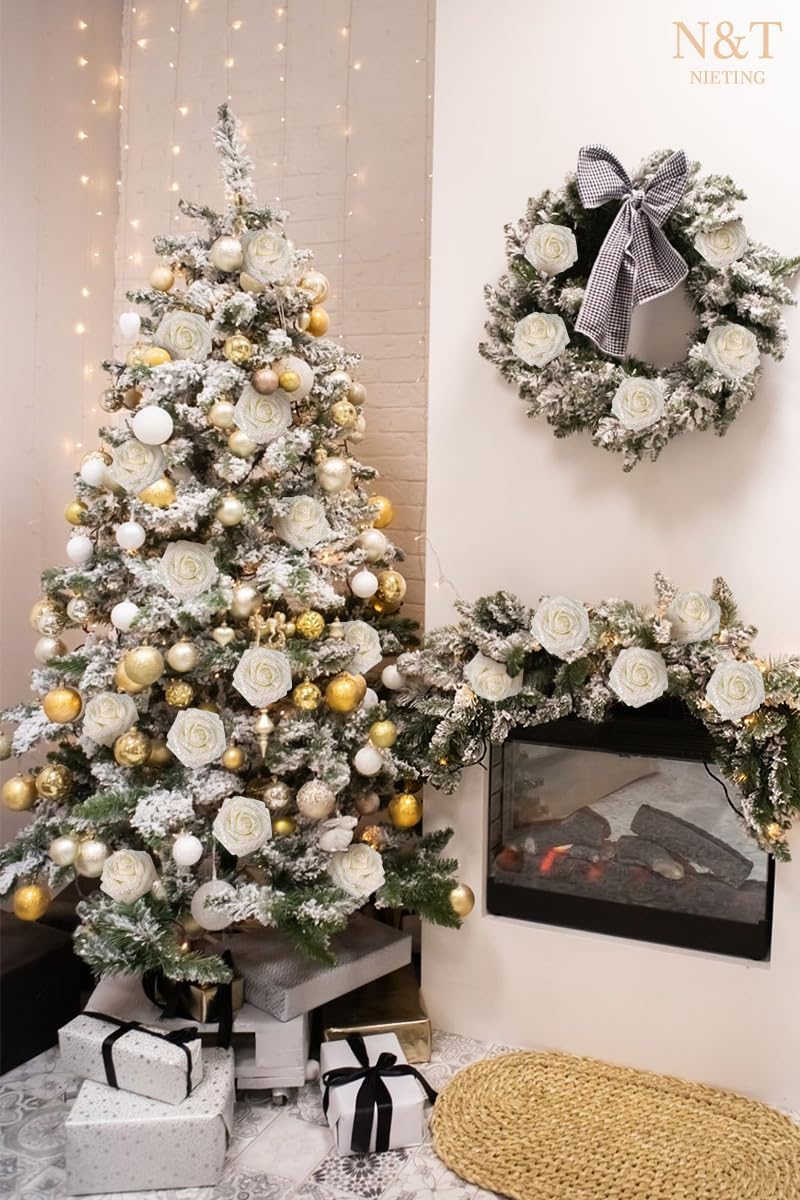 N&T NIETING Artificial Flowers Glitter Roses Flowers 25pcs White Foam Shiny Roses Real Looking Fake Roses with Stem for DIY Wedding Bouquets Centerpieces Bridal Shower Party Home Decorations