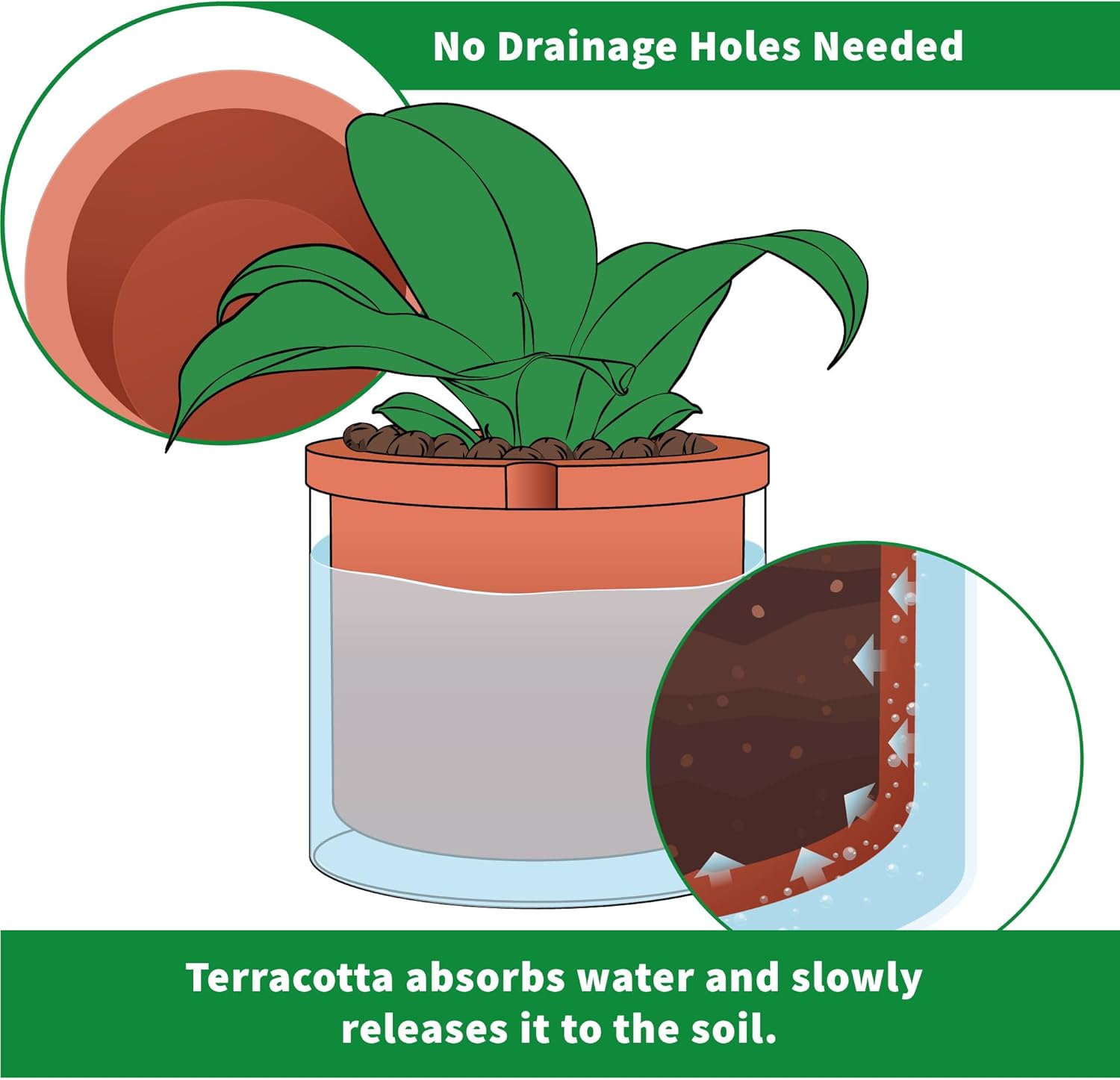 - Self-watering System: The bottom section of the white terracotta pot is unglazed, just fill the glass container with water to ensure plants will absorb only what they need through the terracotta pot walls.