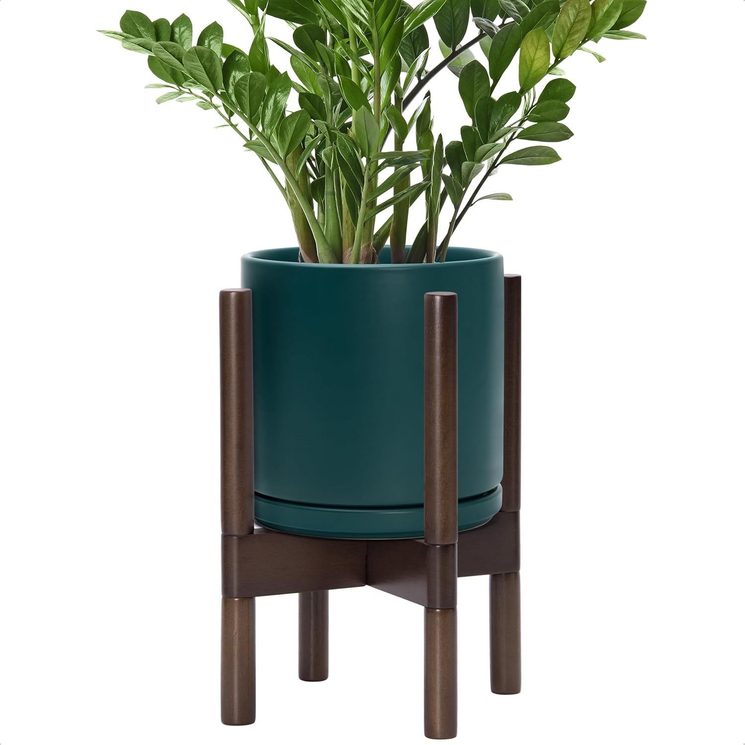 D'vine Dev Ceramic Planter with Walnut Color Stand - 8 Inch Modern Round Flower Pot with Wood Planter Holder, Teal, 55-B-Y-4