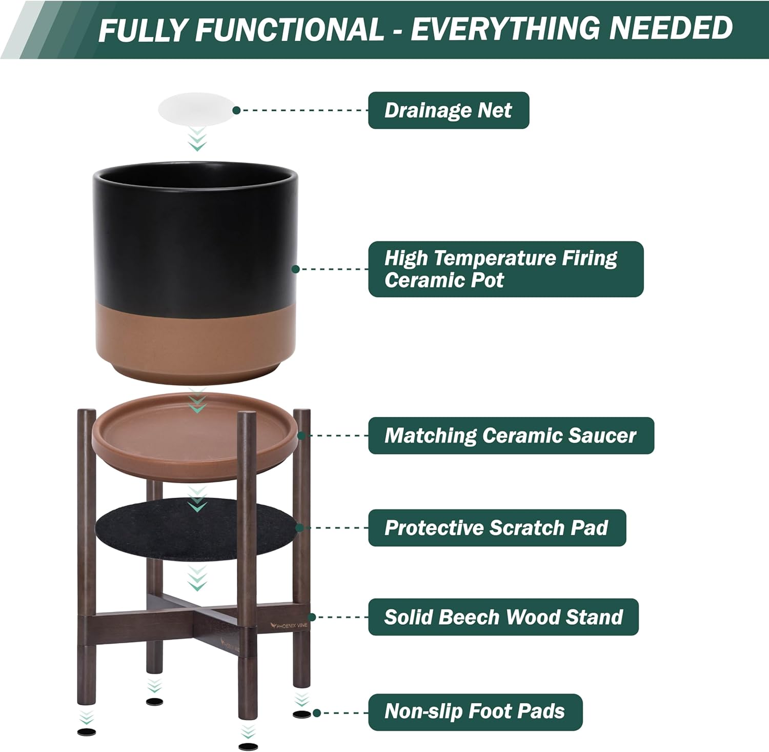 - A Complete Set: Mid-century ceramic planter, combined with a sculptural, solid wood stand that match perfectly together and looks great in anywhere.