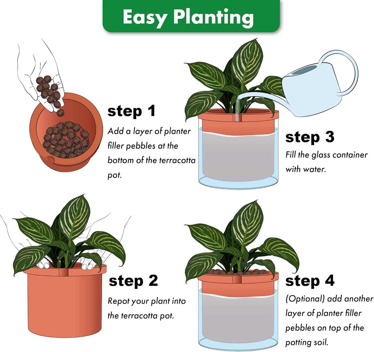 - Self-watering System: The bottom section of the white terracotta pot is unglazed, just fill the glass container with water to ensure plants will absorb only what they need through the terracotta pot walls.