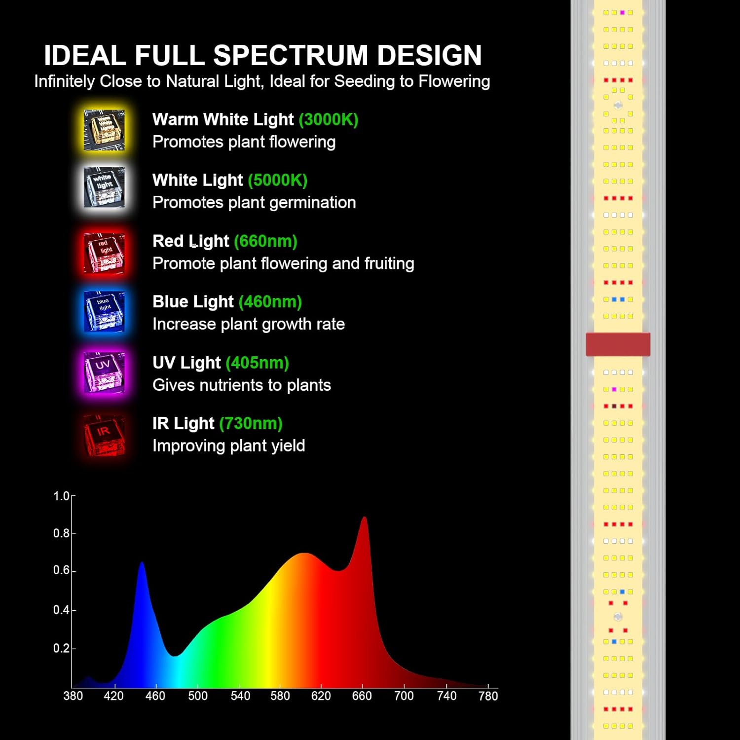 - IDEAL FULL SPECTRUM & DIMMING - AGLEX 800W led grow light consists of full spectrum Warm White3000K, Cool White 5000K, Blue 460nm, Red 660nm, UV 405nm and IR 730nm, is infinitely close to natural sun light, perfect for seeding to flowering, applied to the whole stages of indoor growing plant. Growing lamp 800w comes with flexible dimmable function, 4-level dimming knob from 0-100% available, convenient to adjust the brightness according to the plants at different growing stages.