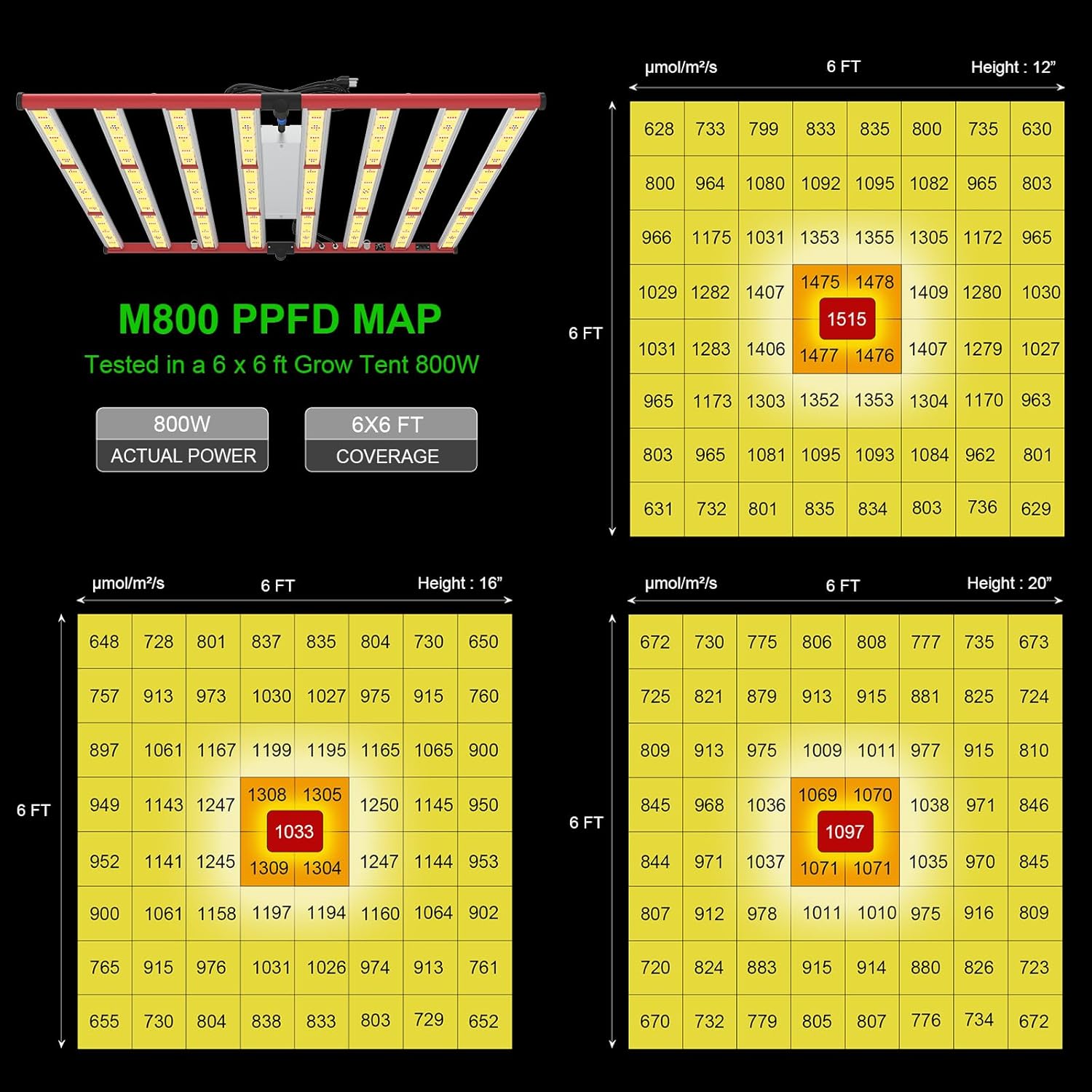 - MAXIMIZE YIELDS & CROP QUALITY - AGLEX M800 led plant growing light is with 2720PCS high efficient chips, only consumes 800w with 2720 leds, achieving higher average PPFD with 1515muol/㎡/s at 6x6ft core coverage. The average yield is more than 2.8g per wattage. The 800w led bar grow light can help you achieve maximum quality and quantity. Wide Input Voltage 100-277V, can meet most input voltage.