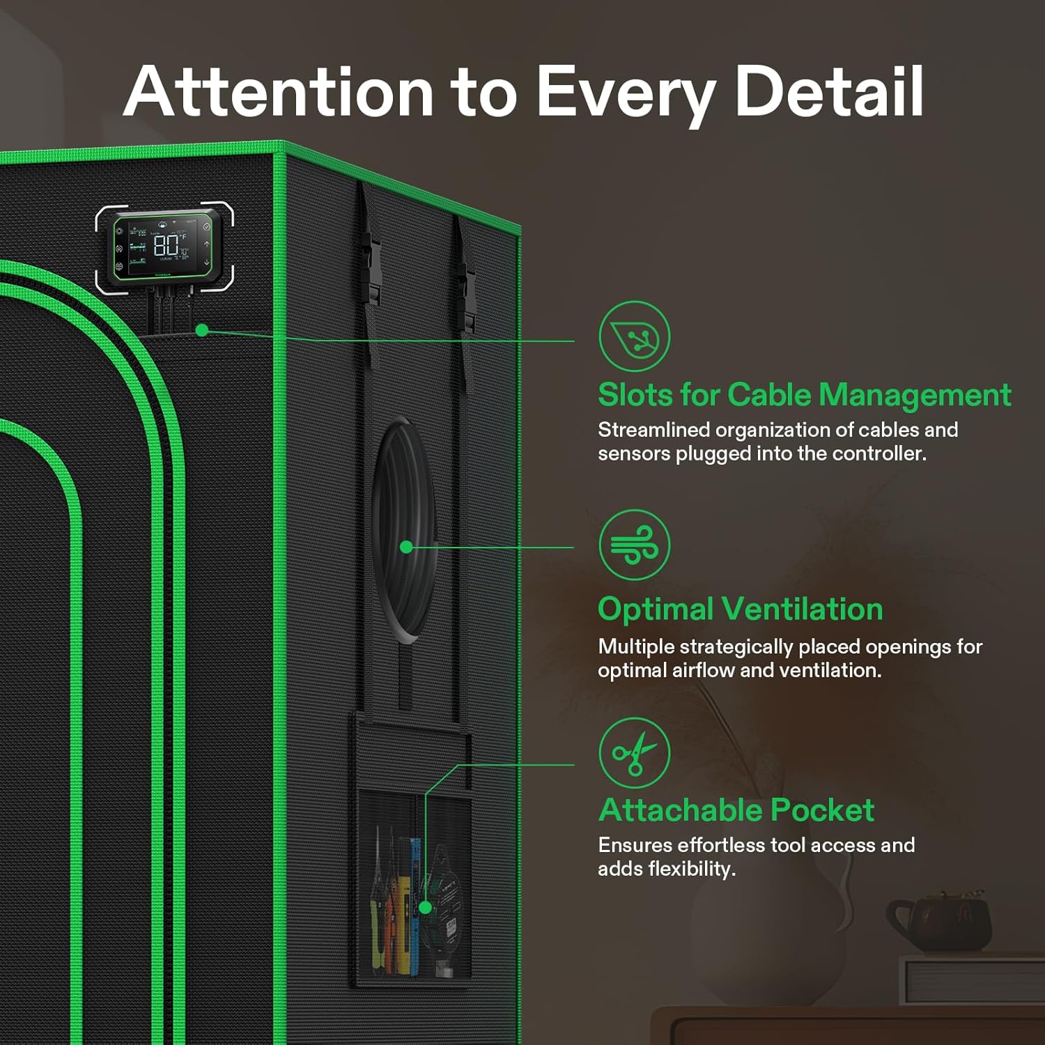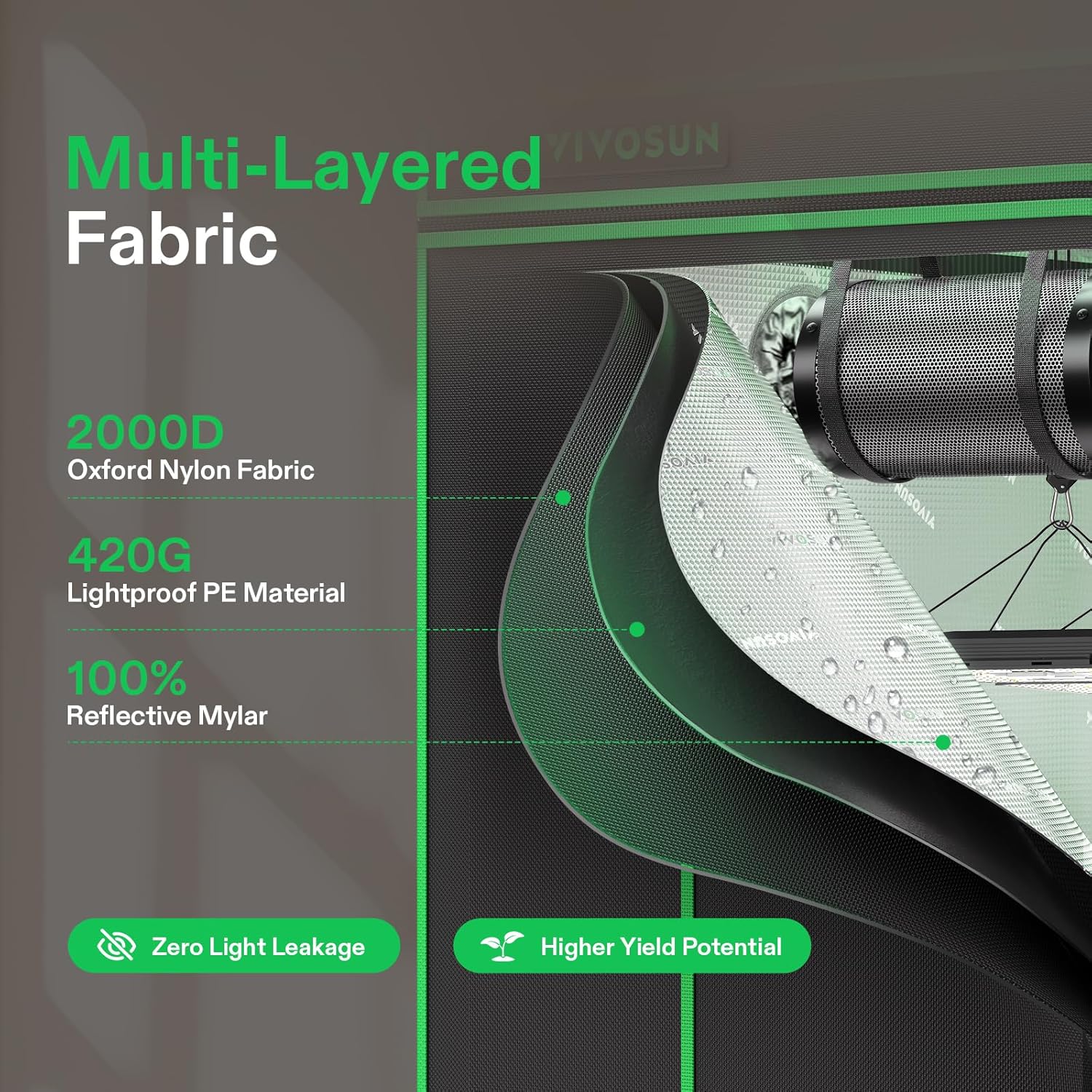 - Upgraded Lightproof Fabric: Durable 2000D Oxford canvas lined with plant-friendly PE and 100%-reflective Mylar; The three-layer thick fabric ensures zero light leaks, boosting the output efficiency of your setup; Zipper section is designed with black inner lining for enhanced light prevention