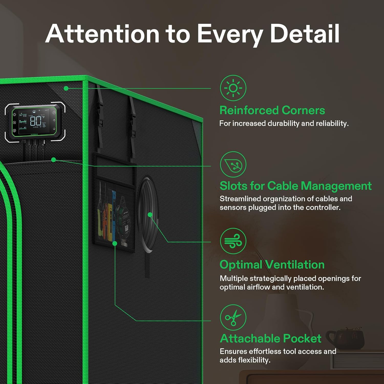 - Upgraded Lightproof Fabric: Durable 2000D Oxford canvas lined with plant-friendly PE and 100%-reflective Mylar; The three-layer thick fabric ensures zero light leaks, boosting the output efficiency of your setup; Zipper section is designed with black inner lining for enhanced light prevention