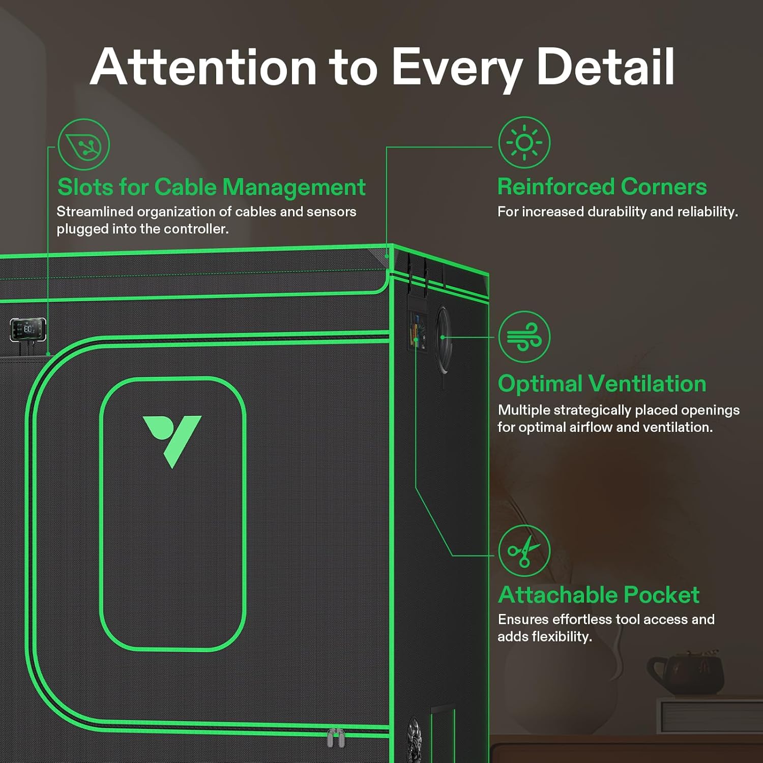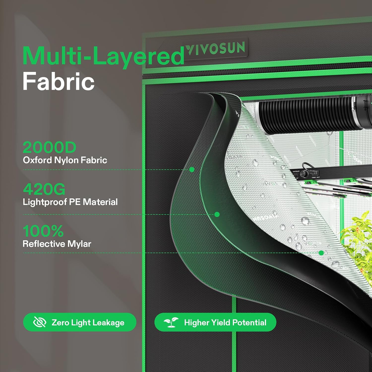 - Upgraded Lightproof Fabric: Durable 2000D Oxford canvas lined with plant-friendly PE and 100%-reflective Mylar; The three-layer thick fabric ensures zero light leaks, boosting the output efficiency of your setup; Zipper section is designed with black inner lining for enhanced light prevention