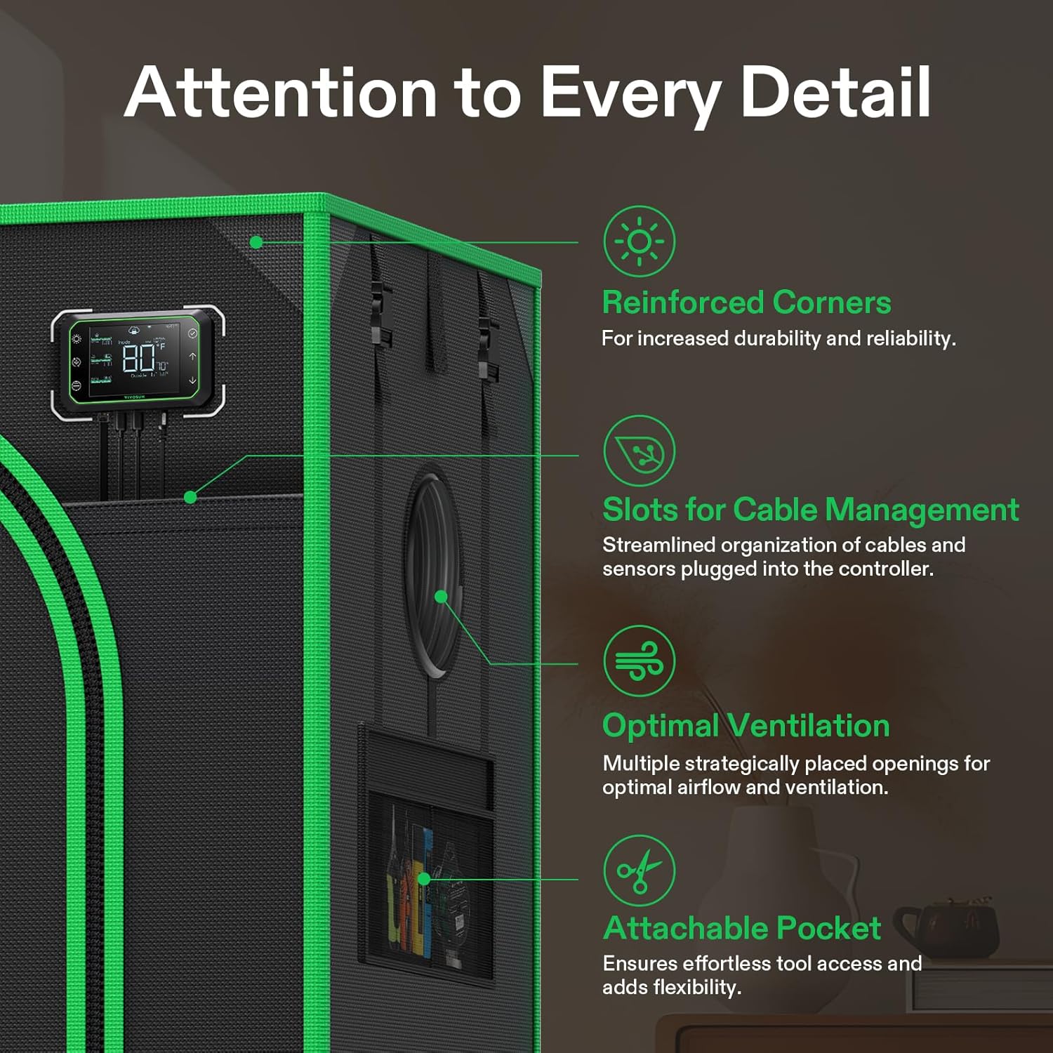 - Thoughtfully Designed: Enjoy a tidy and organized environment with cable management slots tailored for your smart controllers; Experience optimal ventilation through strategically placed openings and effortless tool access with the attachable outside pocket