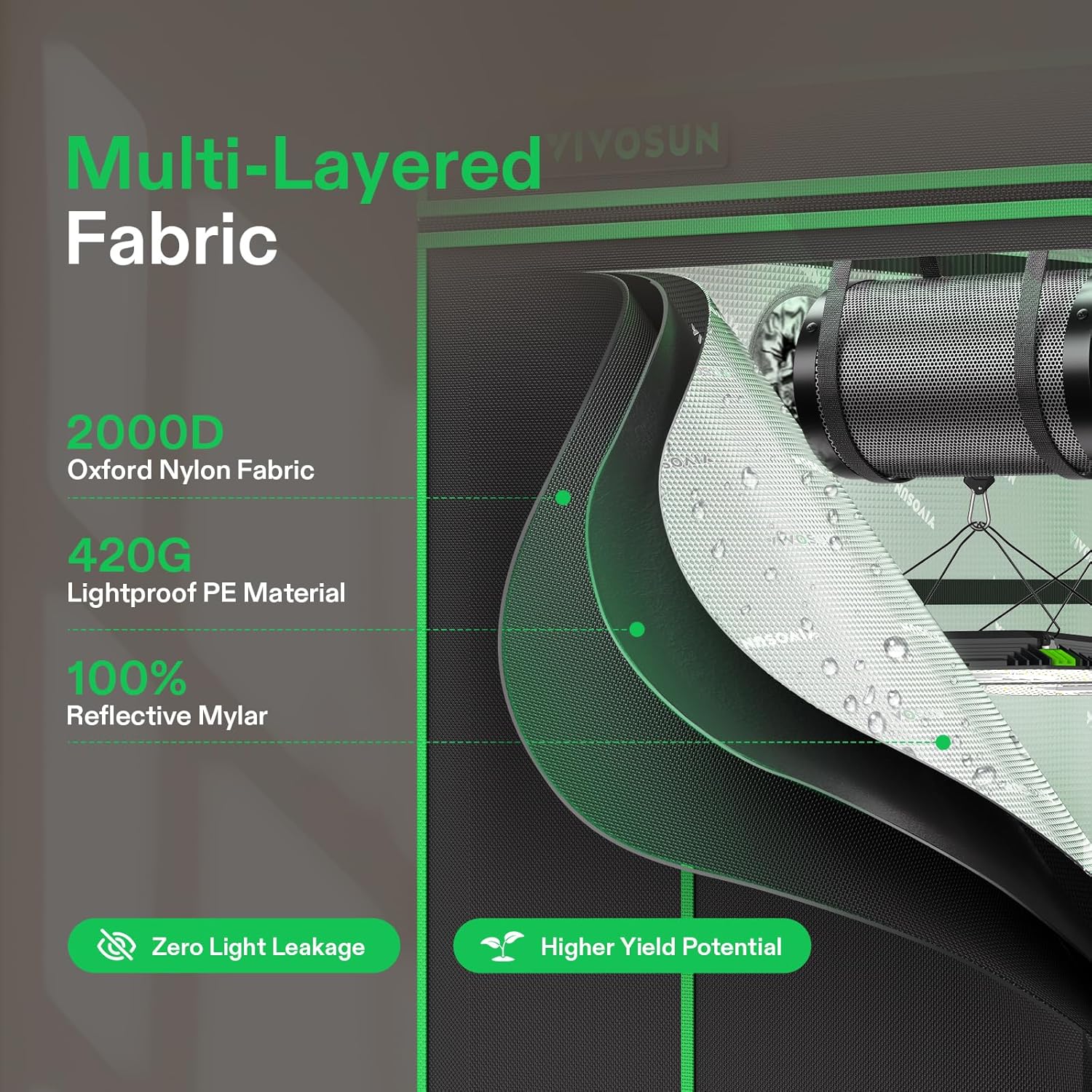 - Upgraded Lightproof Fabric: Durable 2000D Oxford canvas lined with plant-friendly PE and 100%-reflective Mylar; The three-layer thick fabric ensures zero light leaks, boosting the output efficiency of your setup; Zipper section is designed with black inner lining for enhanced light prevention