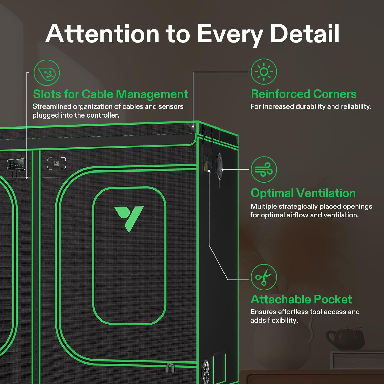 - Upgraded Lightproof Fabric: Durable 2000D Oxford canvas lined with plant-friendly PE and 100%-reflective Mylar; The three-layer thick fabric ensures zero light leaks, boosting the output efficiency of your setup; Zipper section is designed with black inner lining for enhanced light prevention