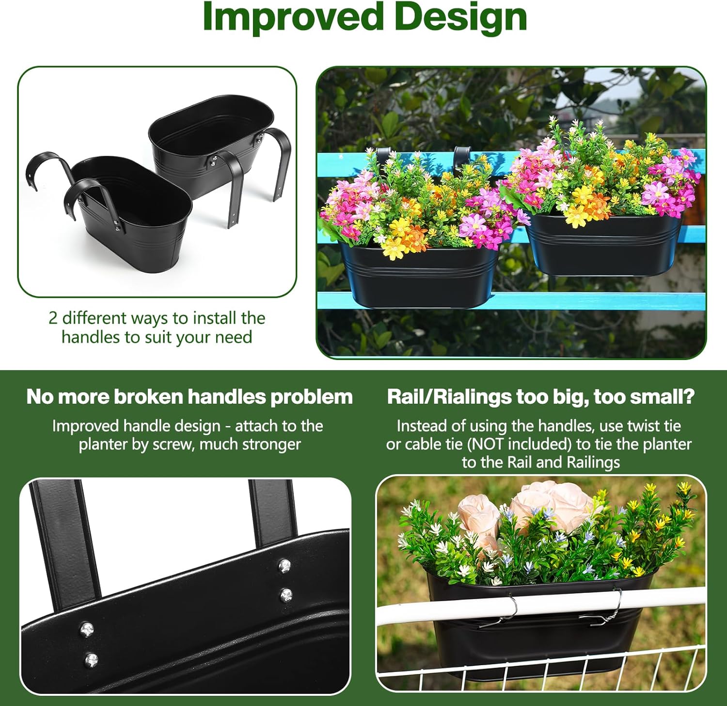 - 【Railing Planter Box】The special design with detachable hooks can be hung on the balcony, window, garden, railing, anywhere in the room, also can be used as beautiful container on desktop. Bucket planters are able to maximize inside growing space allowing dirt and roots to grow strong and deep.