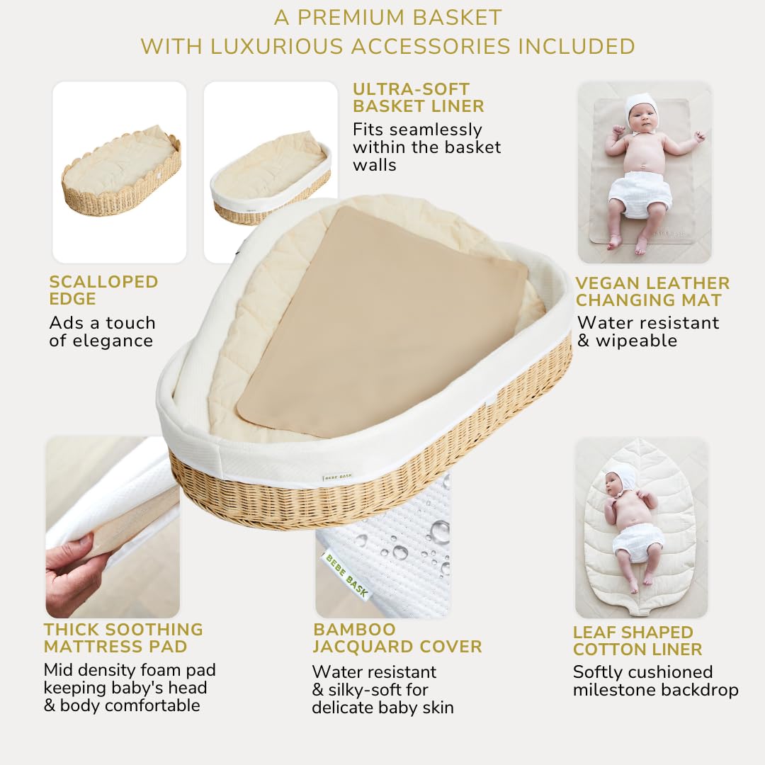 Bebe Bask Premium Baby Changing Basket - Artisan-Crafted Scalloped Rattan - Changing Basket for Baby Dresser - All Accessories Included - Complete Set for Nursery (Natural)