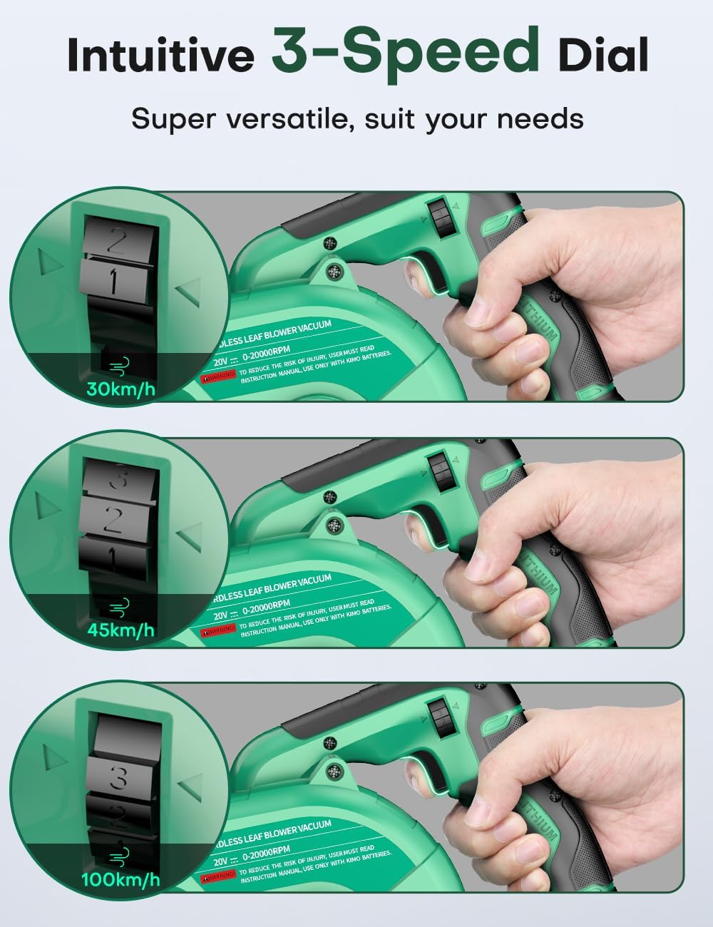 - 🍃【Powerful Motor & 50% Less Noise】KIMO cordless leaf blower & vacuum with a powerful motor and advanced turbine technology. With a maximum wind speed of 150MPH, you can effortlessly tackle even the toughest outdoor cleaning tasks. Plus, a cordless blower without the loud noise that comes from a gas-powered engine, and a cordless blower low-noise design reduces sound by 50%, ensuring a quiet and efficient operation.
