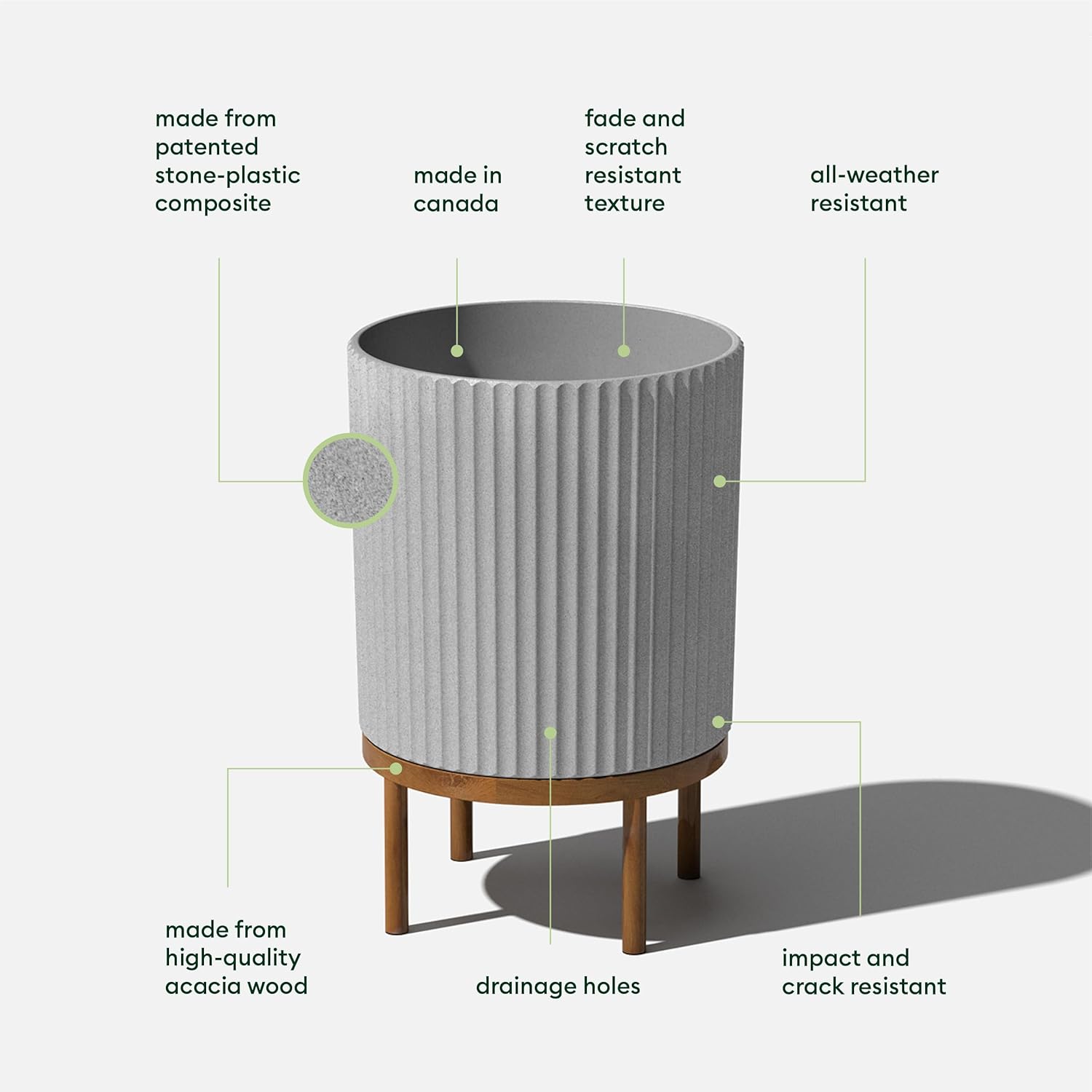 Veradek Demi Series Round Planter w/Stand for Porch/Patio | Durable Plastic-Stone Composite & Wooden Stand | Modern Décor for Tall Plants, Flowers