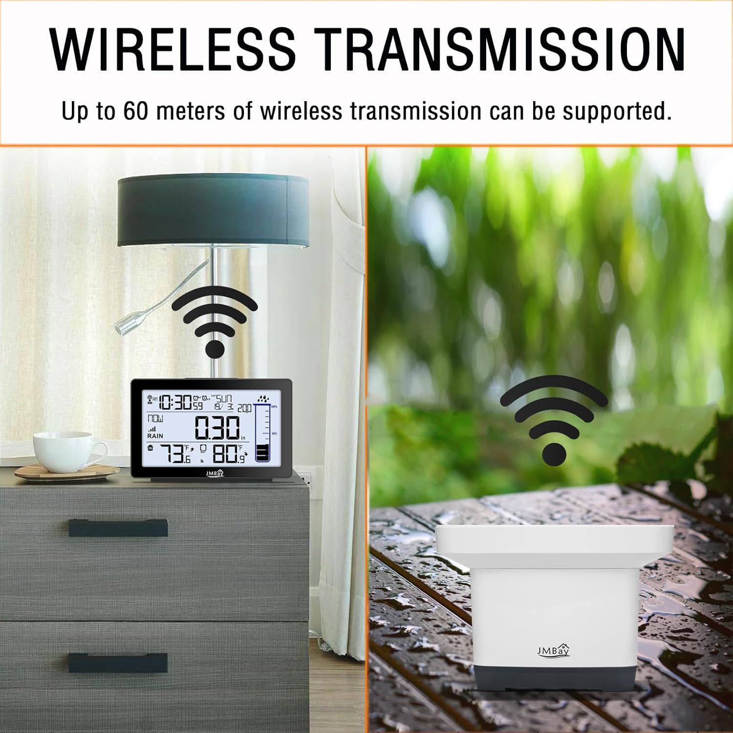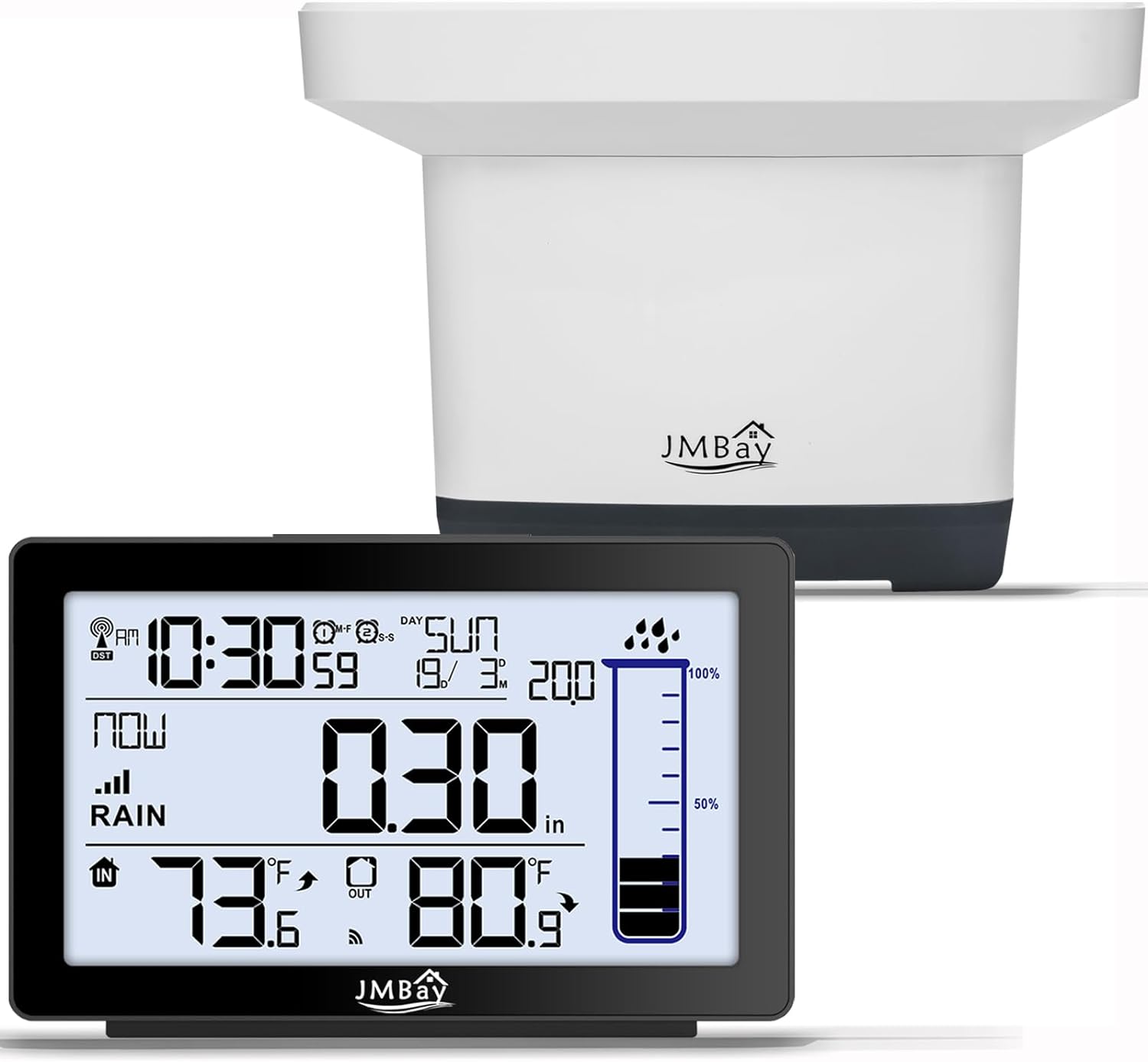 - Multi Function Rain Gauge weather station---In addition to rainfall monitoring, this digital rain gauge can also provide real-time indoor and outdoor temperatures, WWVB Radio control time function. What’s more, dual alarm clock with snooze function and calendar is practical in your usual life. Functional and stylish, JMBay rain gauge weather station is the perfect decoration for your living room, bedroom, office, greenhouse, tent, and more.