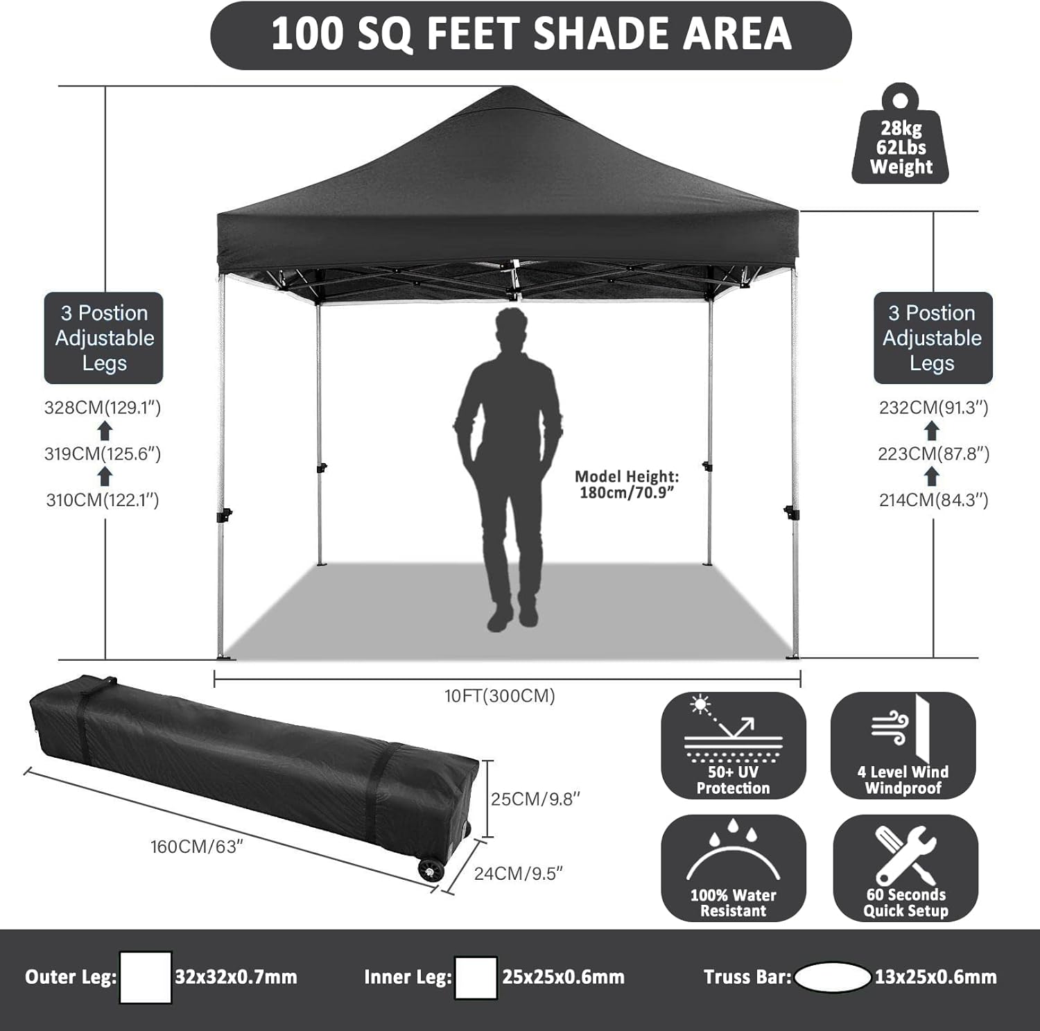 - 【3 Height Settings】10x10 pop up party tent straight leg has 3 height settings. Thumb latch lock system easy to lock and release, raise the pop up tent to a desired height. Canopy tent 10x10 straight leg height options: 214cm/84.3inch, 223cm/87.8inch, 232cm/91.3inch. Corresponding party tent center height options: 310cm/122.0inch, 319cm/125.6inch, 328cm/129.1inch. 10x10 canopy with sidewalls perfect for commercial activities, camping, festivals, tailgating, backyard events and etc..