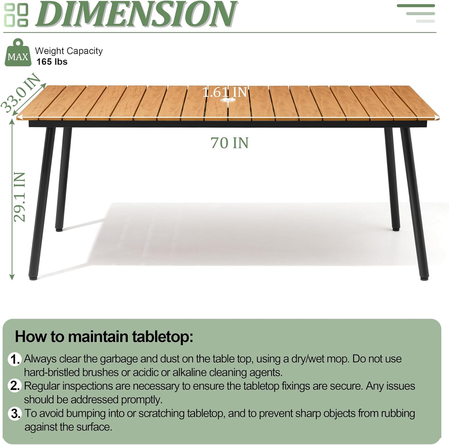 Outdoor Dining Table for 6, 70inch Patio Dining Table with Wooden-Like Top and Aluminum Frame, Rectangular Table with Umbrella Hole Outdoor Furniture, Brown