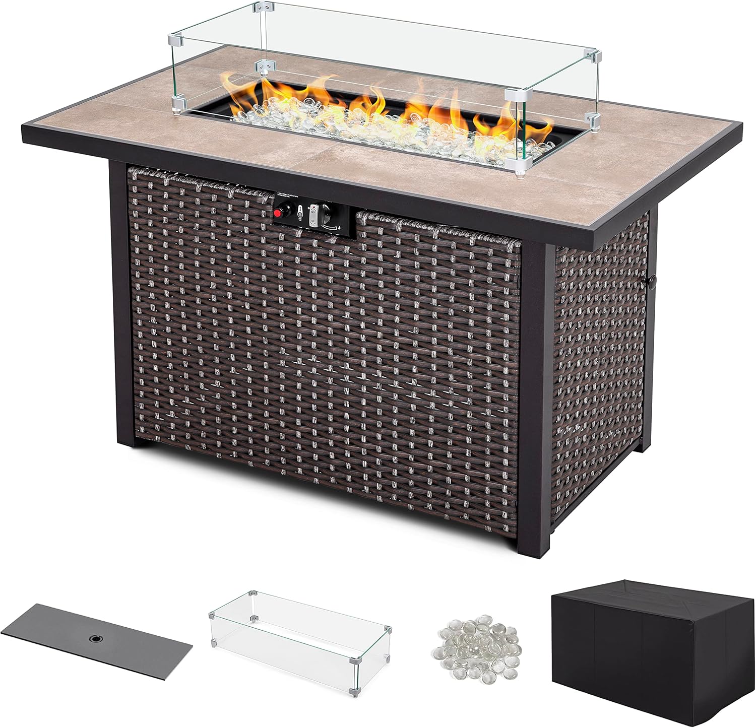 Nuu Garden 43" Propane Fire Pit Table, CSA Certified 50,000 BTU Outdoor Patio Propane Fire Pit Table with Fire Pit Wind Guard, Removable Lid, Ceramic Tabletop, Water-Proof Oxford Cover, Dark Brown