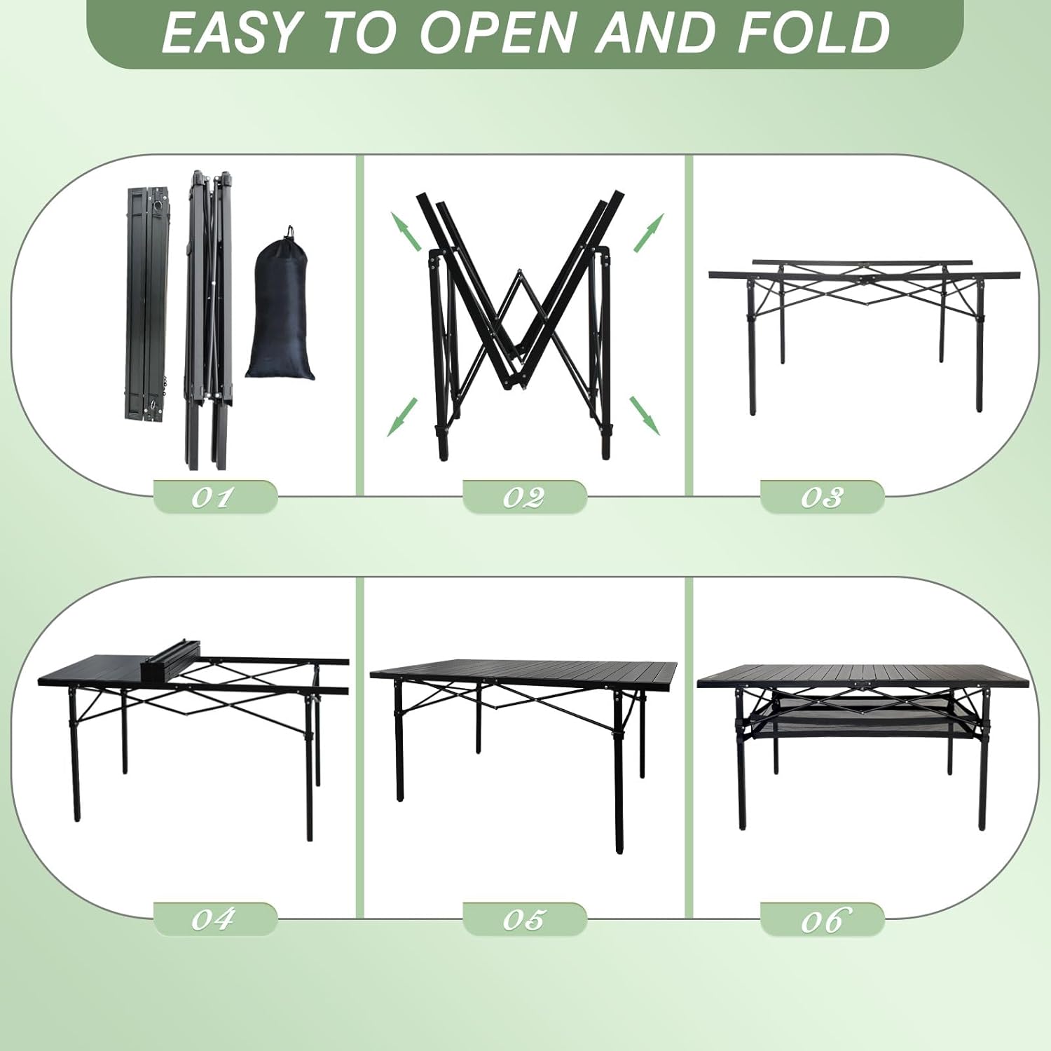 - Portable and easy to carry:The Folding Camping Table is perfect for outdoor activities, such as camping, traveling, and beach outings, as well as indoor use. Made of lightweight aluminum alloy, this table is portable and easy to carry around thanks to its attached tote bag. It won't take up too much space in your car.