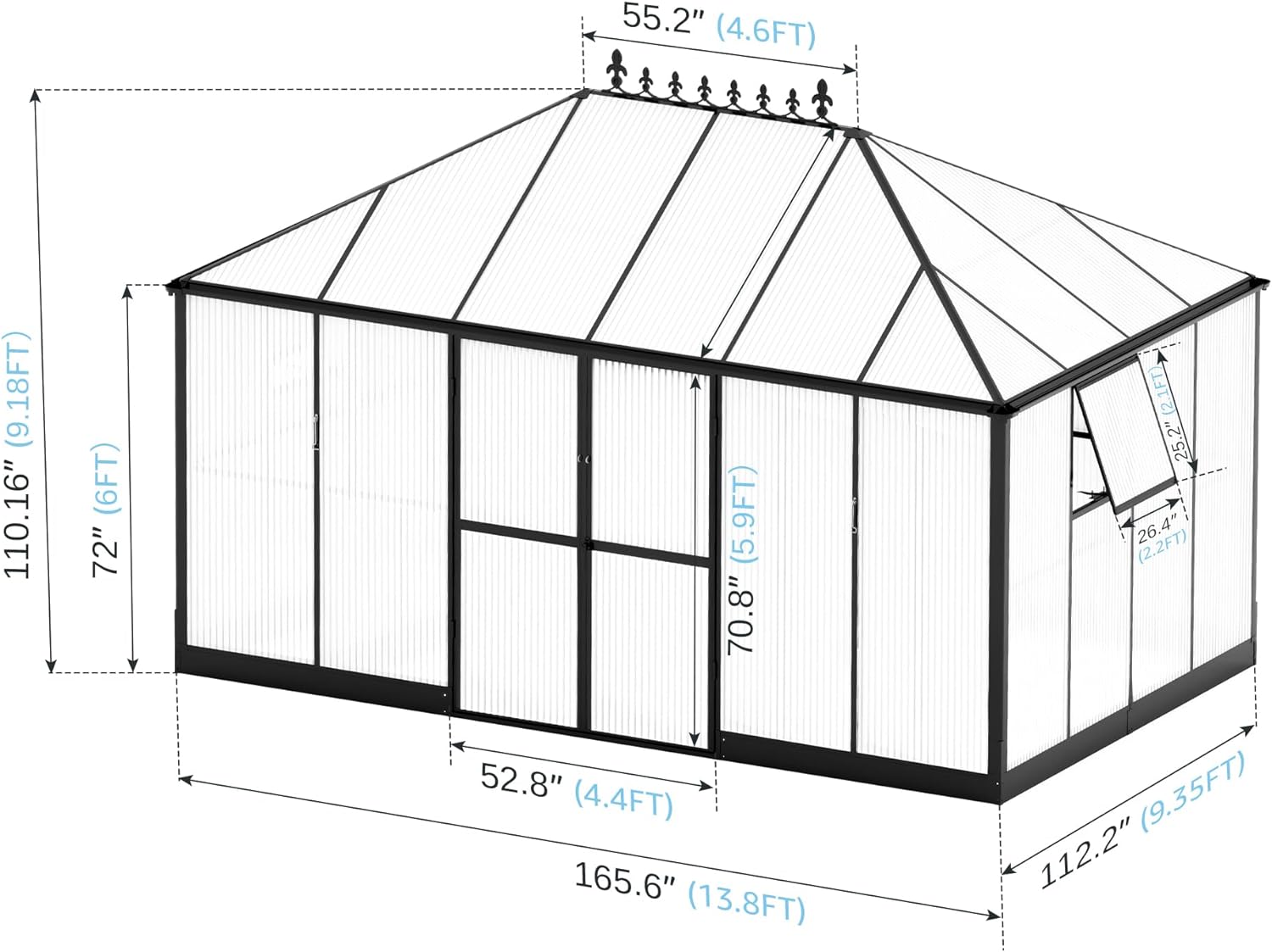- 【Versatile Space】850 cu. Ft. to create a perfect warm environment for your personal plants. Transform your polycarbonate greenhouse into a functional living space by adding furniture. Exclusive design patent & a spear-like top discourages bird perching. Recommended to build a 15x10.5 FT foundation for it