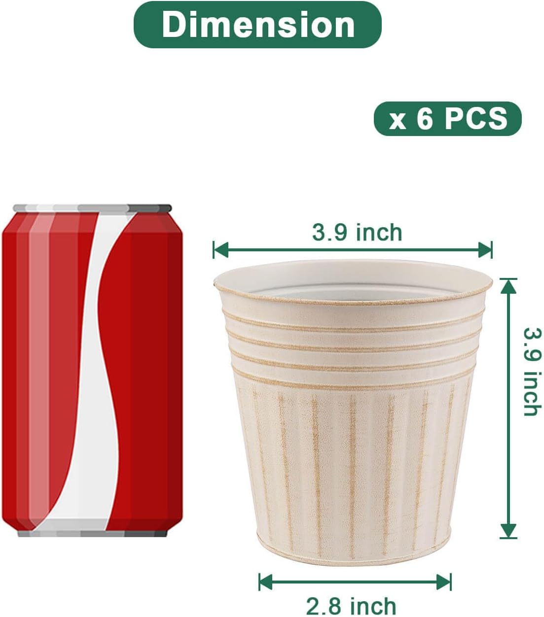 - 【Size of Metal Flower Pots】There are 6pcs metal planters in a package. The topper opening diameter 3.9 inches, the bottom diameter 2.8 inches, and the barrel height is 3.9 inches. These tin buckets have ample space for plant growth, making them ideal for succulents, herbs, and flowers, keeping your greenery vibrant.