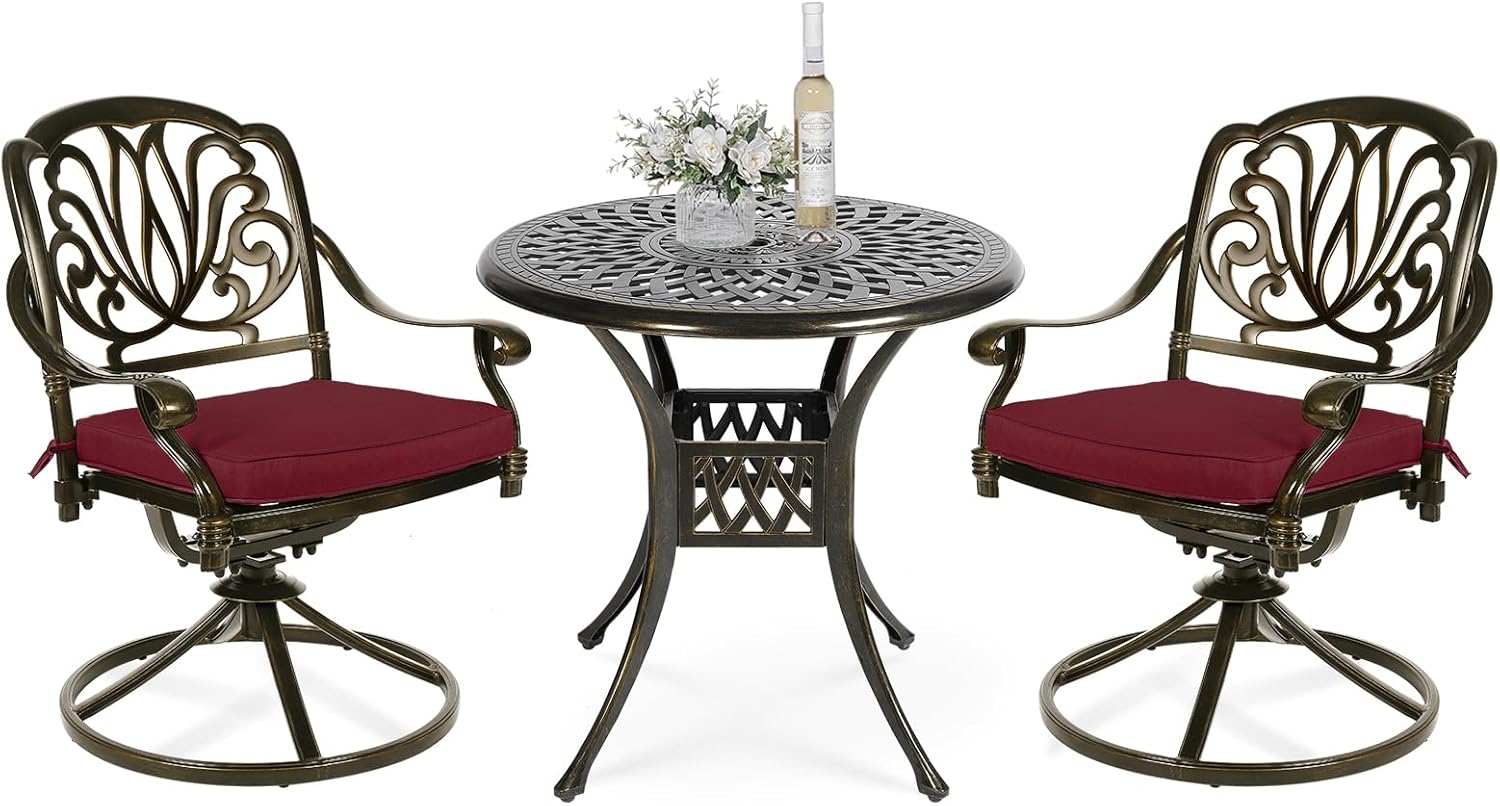 - 【STYLISH APPEARANCE】 - This 3-Piece Dining Set includes 2 swivel dining chairs and 31" round cast table. Elegant cast accents scroll across the chairs and table top, adding a level of sophistication and craftsmanship to the collection. Perfect addition to your patio, yard, deck, or porch.