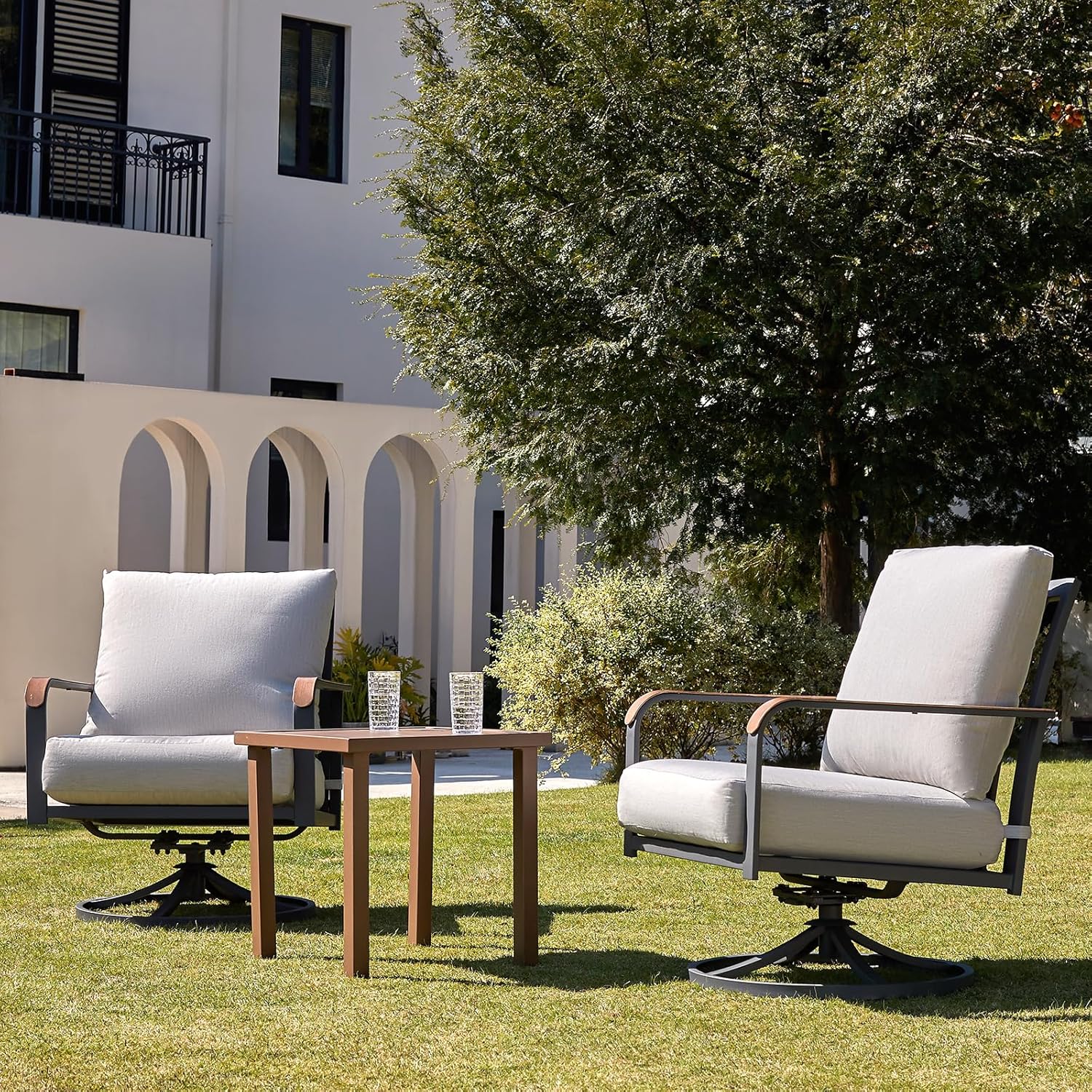 • 【Modern Unique Decor】This patio bistro set is designed to be modern and stylish,provide you a comfortable experience. The balance design of the rocking swivel chair is very good. Gently shake or rotate 360 degrees back and forth. Sway quietly to better relieve fatigue and stress, your family and friends could sit on the rocking swivel chair set and enjoy leisure time with you happliy.