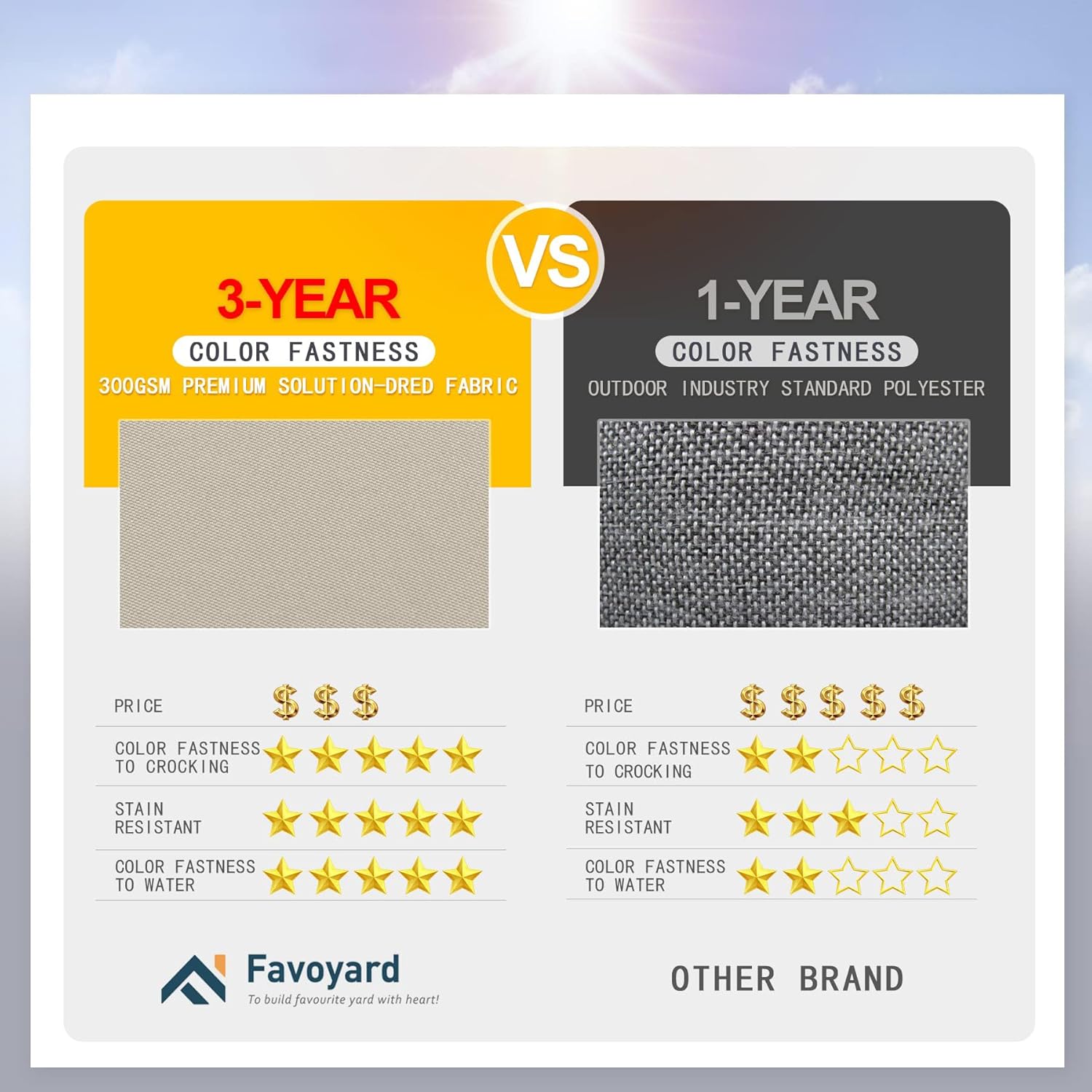 - 3-year Color Fastness - Our patio chair cushions adopt 300GSM High Density polyester fabric, thanks to the superb coloring technology, we proudly say the fading resistant is 20 times that of ordinary products, Favoyard outdoor seat cushion for patio furniture is a perfect decor in garden, patio, beach and etc.
