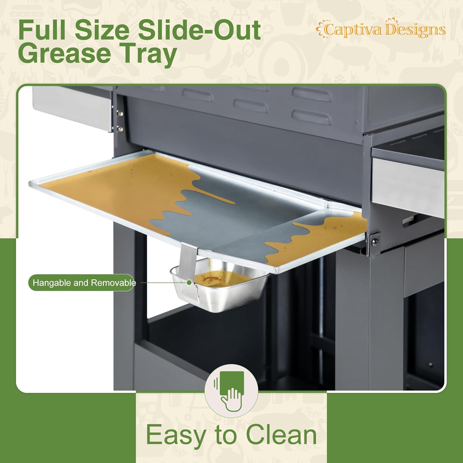 - ๐๐๐ฌ๐ฒ ๐ญ๐จ ๐๐ฅ๐๐๐ง: Below the grill chamber body, there is a fullsized slideout grease tray, and it has been designed with a tilt so that the grease can flow directly into the hanging grease box below. The design of the slideout greasetray and the hanging grease box makes grilling cleaning much easier after BBQ time