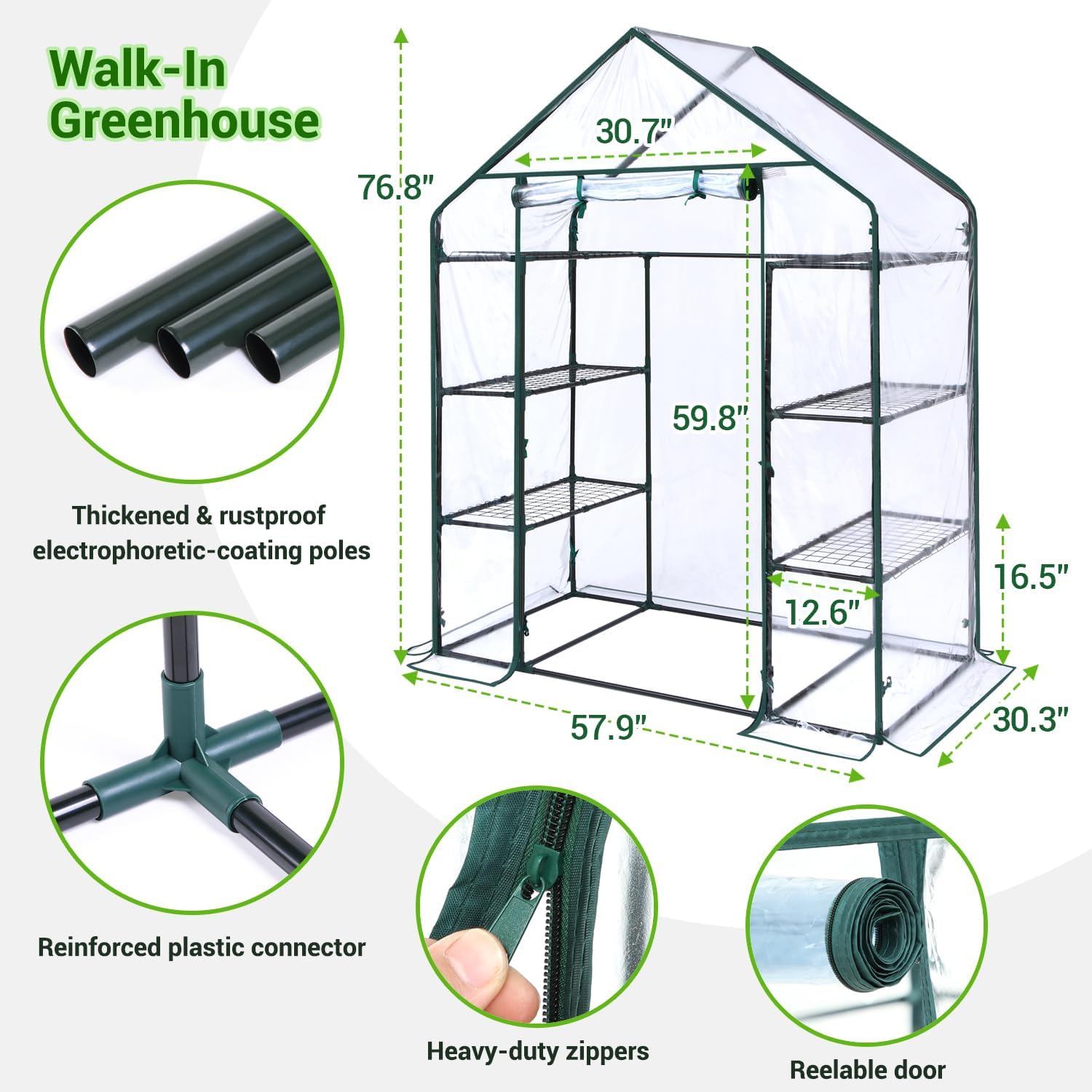 - Heavy-Duty PVC Cover: The small greenhouse features a reinforced PVC cover with double-stitched seams for extra durability and tear resistance. The 6.4-ft high structure and the large roll-up door with high-quality zippers allow for easy access and convenient care of your beloved plants