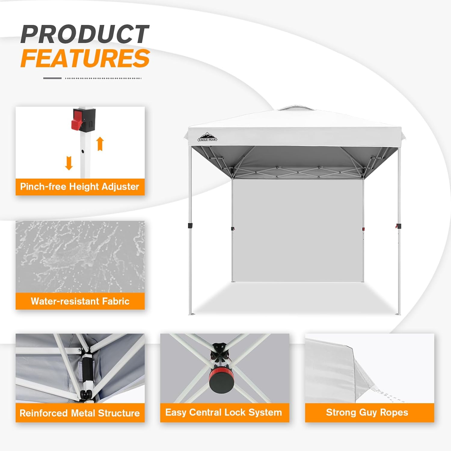 - DURABLE & SPACIOUS: This EAGLE PEAK event canopy provides shade for 5-7 people. Adjust the peak height easily with the pinch free leg release. Built with a powder coated steel frame and hardened through bolts, it ensures lasting durability. The coating resists rust and corrosion, making it an ideal event shelter for farmers' markets, the beach, parties, festivals, and sports events.