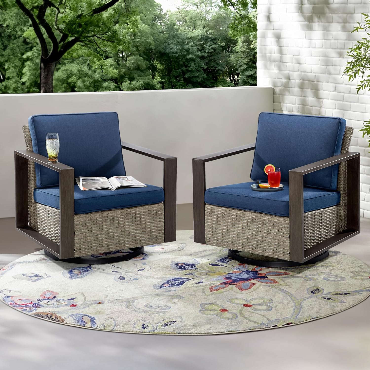 Outdoor Swivel Patio Metal Chairs Set of 2 - Porch Furniture 2 Pieces 360 Degree Glider Rockers Rattan Chairs with Washable Cushion & Metal Steel Rectangular Framed Armrest, Dark Blue