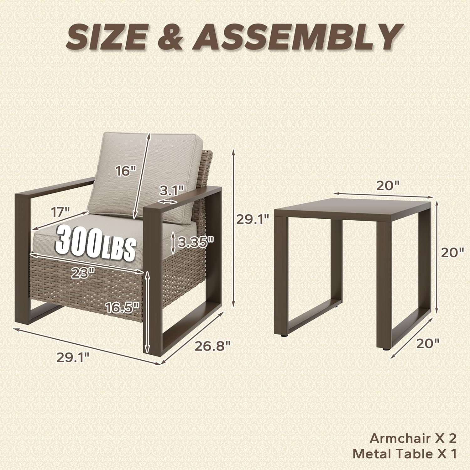 Outdoor Wicker Metal Chairs Set of 2 with Matching Side Table - 3 Pieces Patio Bistro Set with Removable Olefin Fabric Cushions & Rectangular Framed Wood-Looking Metal Armrest, Beige