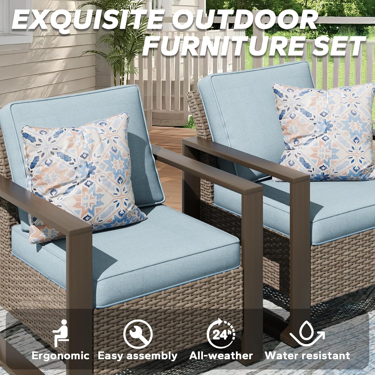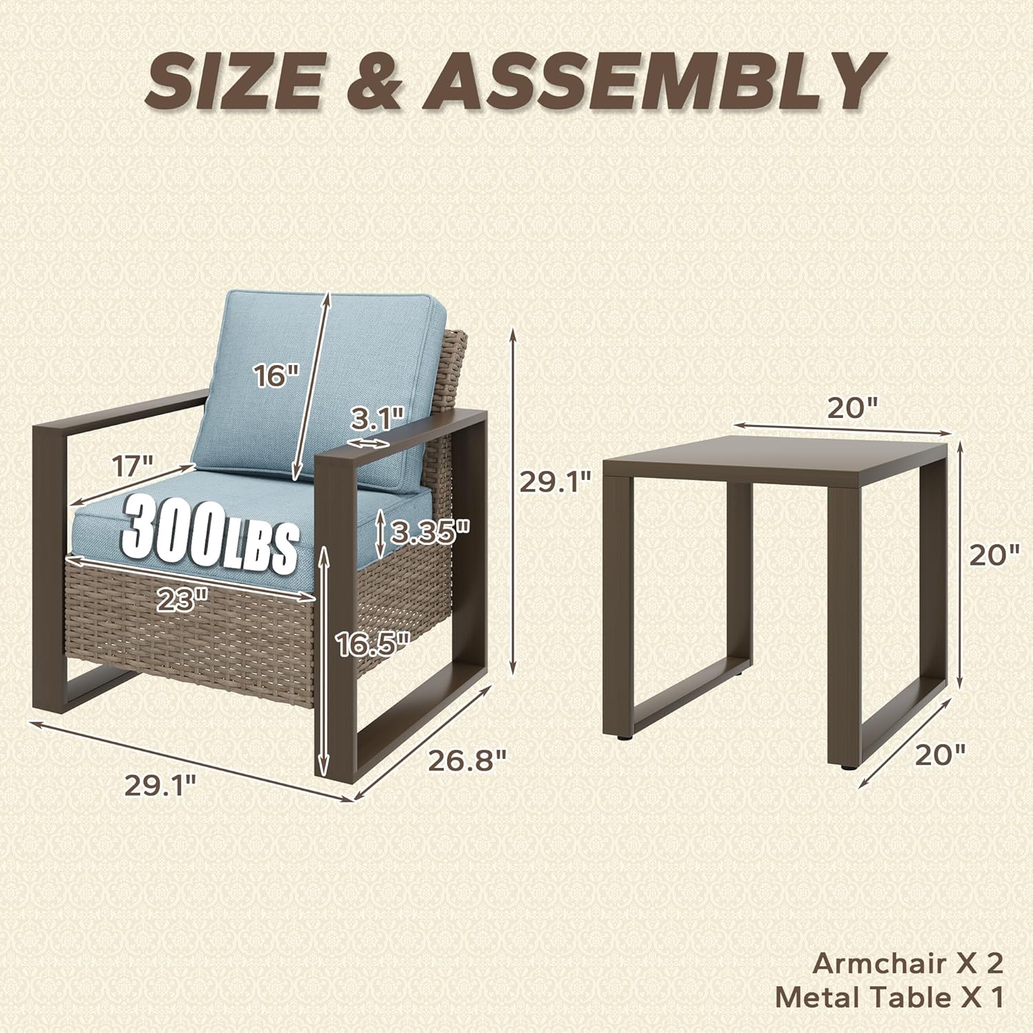 - COMPLIMENTARY SIDE TABLE: This wicker chair set comes with an aluminum side table with stylish look, which is an ideal addition to the patio chairs.