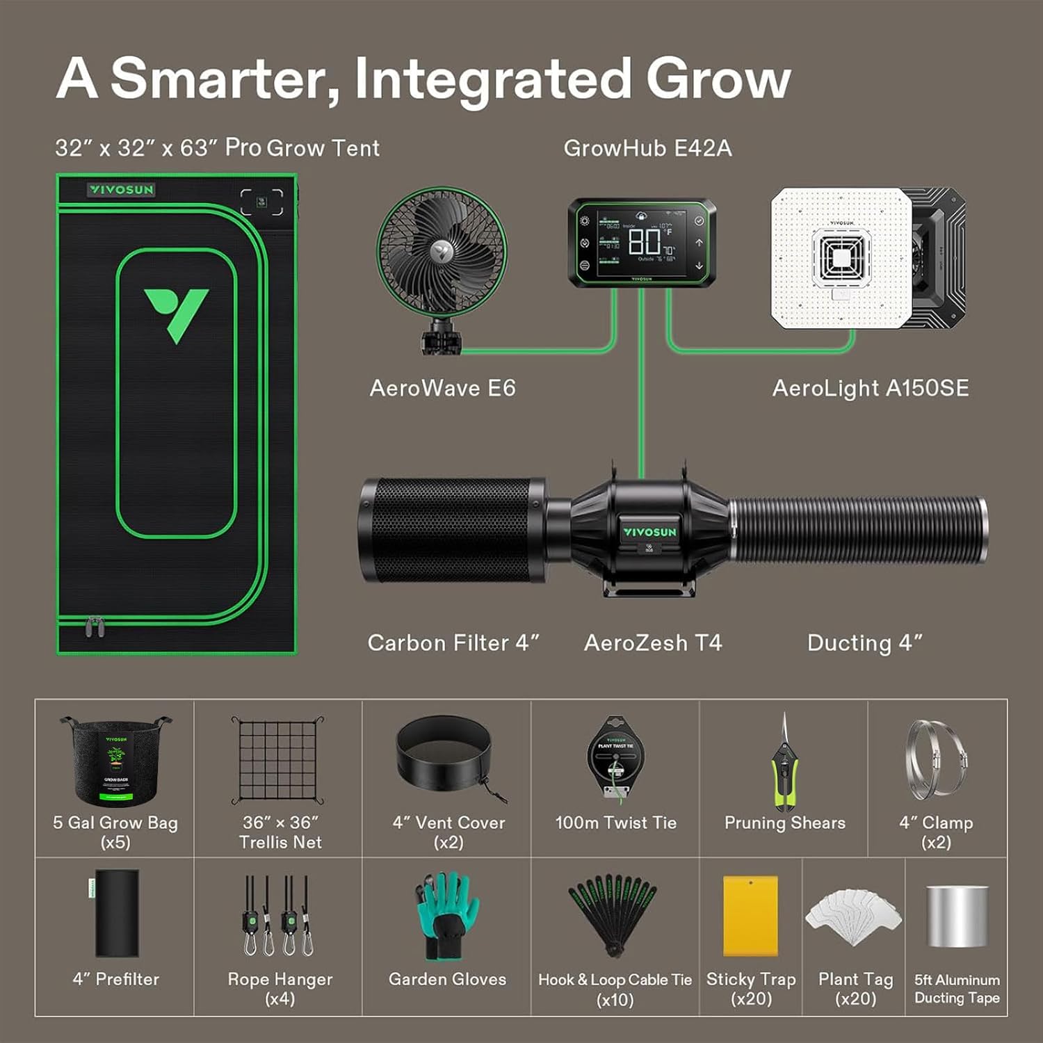 - Complete Plus Kit Included: 32"x32"x63" PRO Grow Tent; AeroLight A150SE 150W LED Grow Light; AeroZesh T4 4" Duct Fan; AeroWave E6 Clip Fan; GrowHub E42A Controller; 4" Carbon Filter; 4" Prefilter; 4" 8ft Ducting; 4" Clamp×2; 36”×36” Trellis Net; 5 Gal Grow Bag×5; 4" Vent Cover×2; Pruning Shears; 100m Twist Tie; Sticky Trap×20; Plant Tag×20; Hook & Loop Cable Tie×10; 5ft Aluminum Ducting Tape; Garden Gloves; Rope Hanger×4