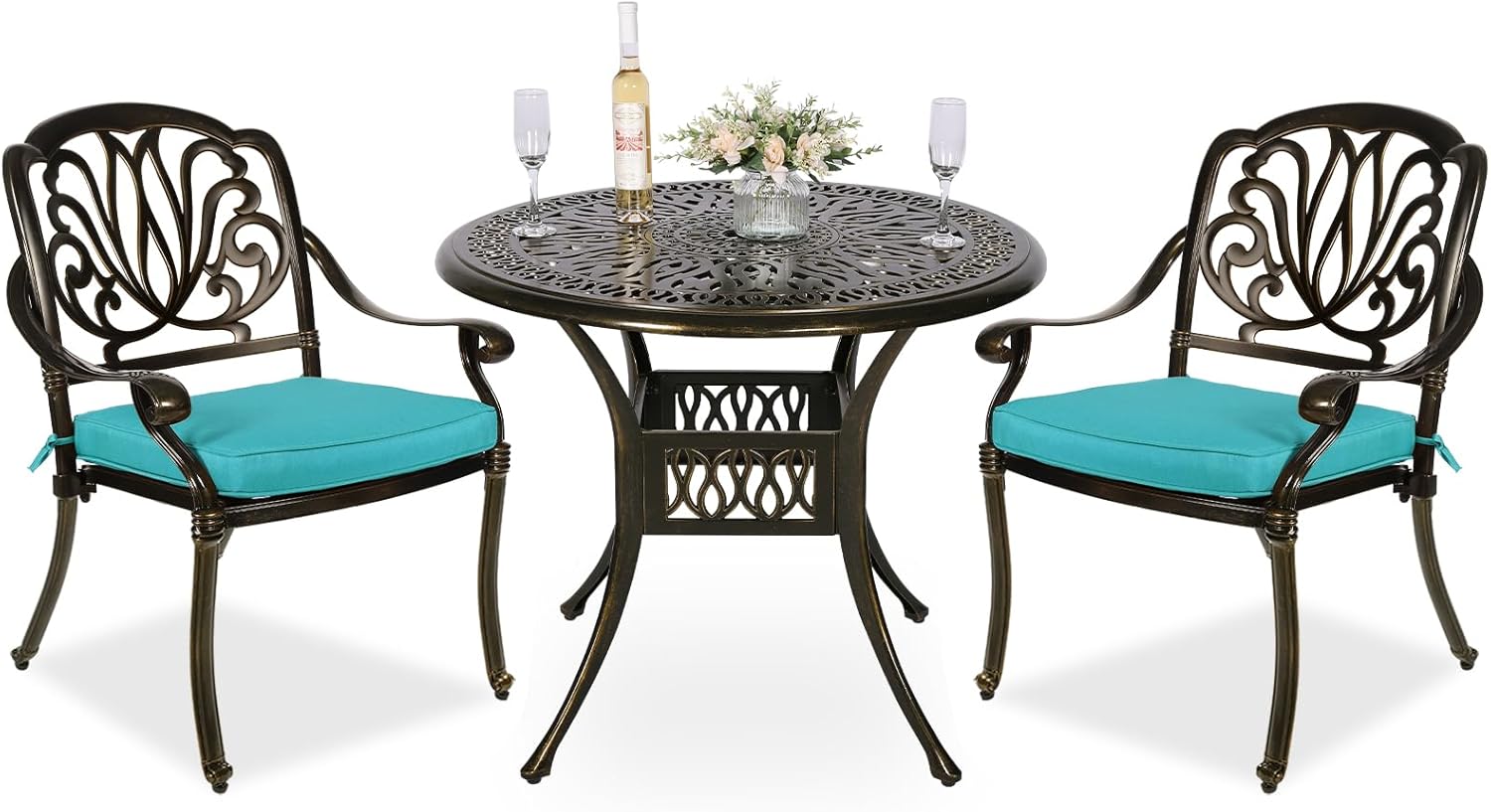 - ALL-WEATHER, RUST-RESISTANT DESIGN: This beautiful 3-piece patio dining set is made to last with all-weather, rust-resistant cast aluminum to endure any weather