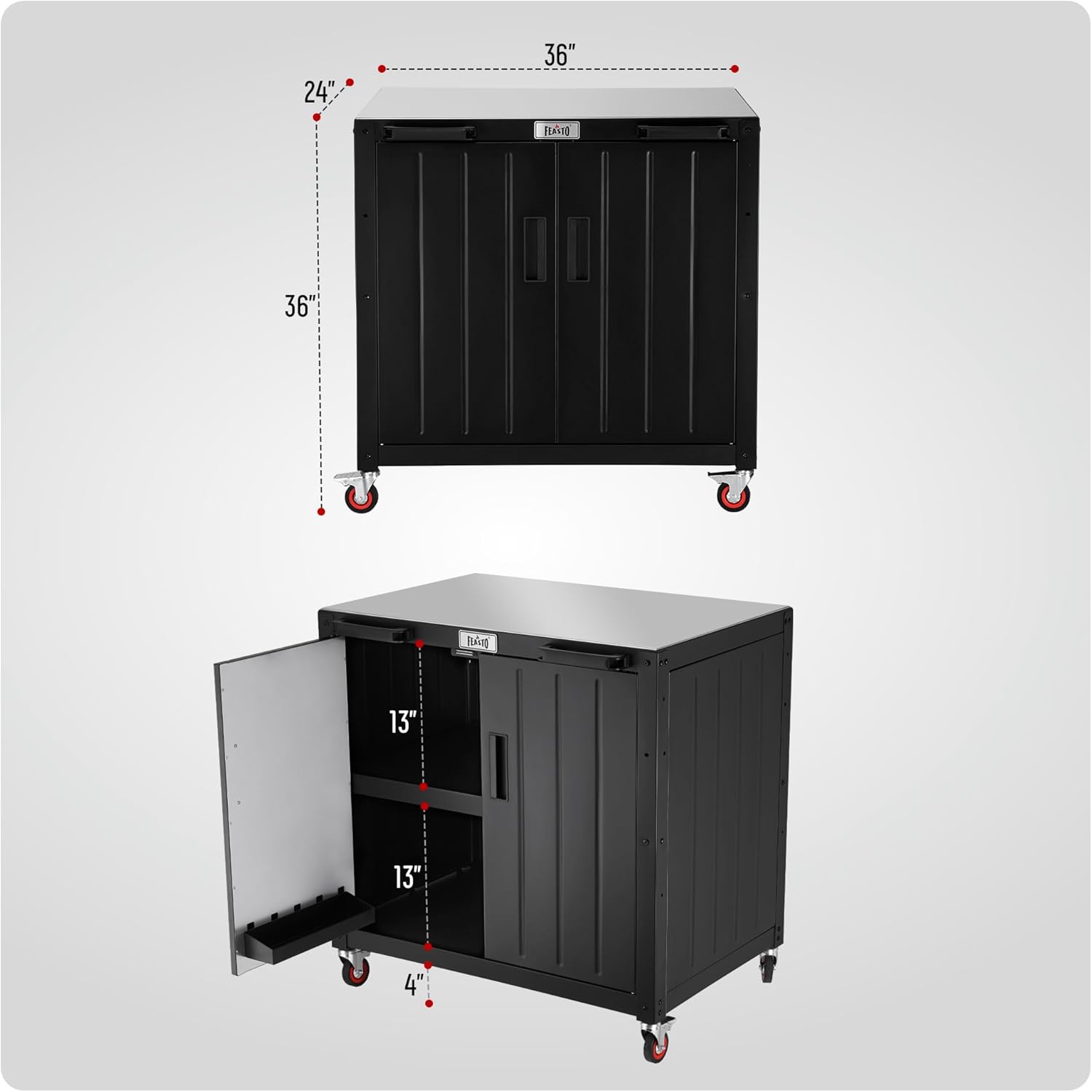 - Large Storage: L 35.4” x W 24” stainless steel table top efficient preparation and serving space.Extra 2 interior shelf storage cabinet features total 104 gallons.The large enough outdoor storage cabinet can improve efficiency for outdoor cooking